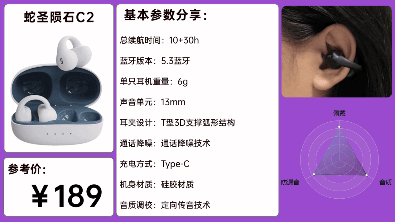 音质与防漏音评测:音质中规中矩,三频分布均衡,人声清晰可辨,低音有一定量感但下潜不深,高音不刺耳,能满足日常听音乐、看视频的基础需求。漏音控制一般,在安静环境下音量适中时,不易打扰他人;音量超过60%则漏音明显,适合在轻度嘈杂的环境下使用。配置性能评测:支持蓝牙5.3,连接稳定,延迟低至50ms左右,能满足日常听歌、追剧需求,偶尔玩轻度游戏也没问题。单耳续航约6小时,搭配充电盒总续航24小时,支持触控操作,内置麦克风结合基础降噪算法,通话时能减少部分背景杂音,性价比突出。10.蛇 圣 陨 石C 2耳机