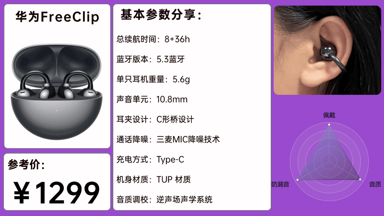 配置性能评测:搭载蓝牙5.4芯片,连接稳定且延迟低至45ms,能满足游戏、看剧等对延迟敏感的场景。配备双麦克风AI通话降噪,通话时可有效过滤背景杂音,保证清晰沟通。续航表现持久,单耳续航8小时,搭配充电盒总续航31小时,日常使用不用频繁充电;还具备IPX5级防水防汗,运动时也能放心用,综合配置在百元级产品中表现均衡且实用。2.华 为F re eC li p耳机