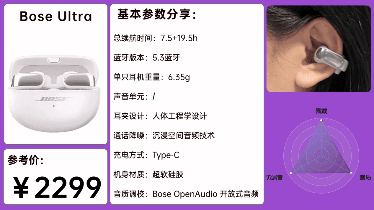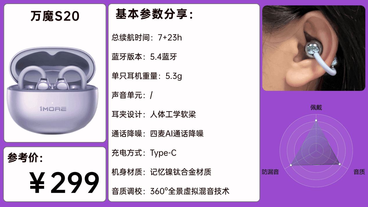 开放式耳机并非智商税。如果你想选一款长时间佩戴不疼、运动时不易掉落,通勤时能听到周围声音、办公时不用摘耳机也能正常沟通的耳机,开放式耳机的核心优势就在于此,能实现听歌不隔绝外界,这是传统入耳式耳机无法做到的。不过购买时要避免被割韭菜:如果你的核心需求是佩戴舒适,几百块钱的开放式耳机已经足够满足需求,按需购买就不算交智商税;但要是盲目跟风买高价款,却用不上其附加功能,就很可能踩坑。知识点二:开放式耳机会对耳朵造成影响吗?