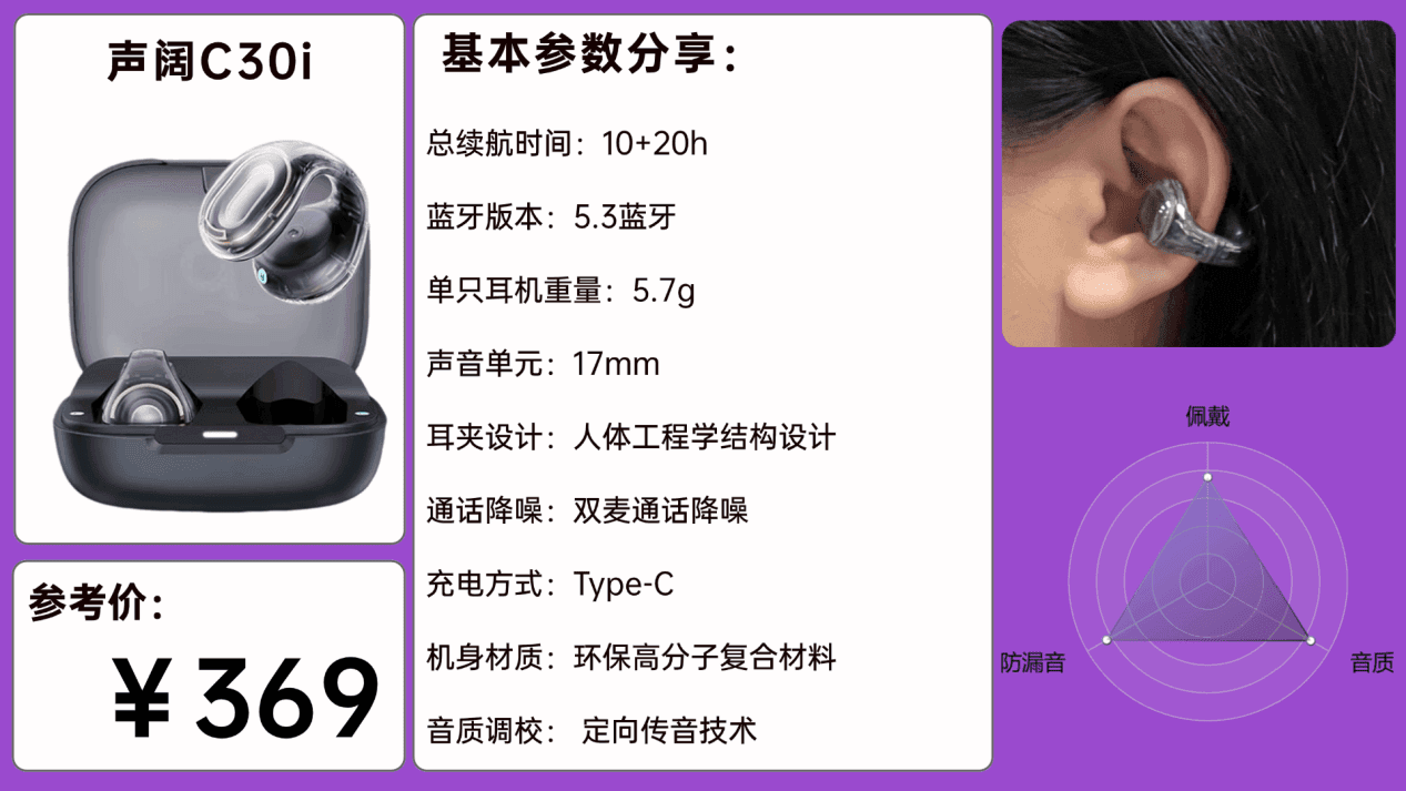 音质与防漏音评测:采用定向传音设计结合漏音消除技术,声音失真率低;12mm发声单元搭配双复合振膜,经专业调校后能呈现360°澎湃声场,高音不刺耳,人声清晰自然,低音表现也比较扎实,听感均衡。防漏音虽未搭载高阶技术,但通过优化振膜结构和出音孔布局,在常规公共场所,音量不超60%时漏音不会影响他人。配置性能评测:蓝牙连接稳定,支持多点连接,可同时连接两台设备并无缝切换。续航表现满足日常需求,单耳续航6小时,搭配充电盒总续航28小时,充电15分钟可额外获得2.5小时播放时间。支持智能佩戴检测,摘下耳机自动暂停,戴上自动播放,综合性价比不错,适合预算中等的用户。5.声 阔C 3 0 i耳机