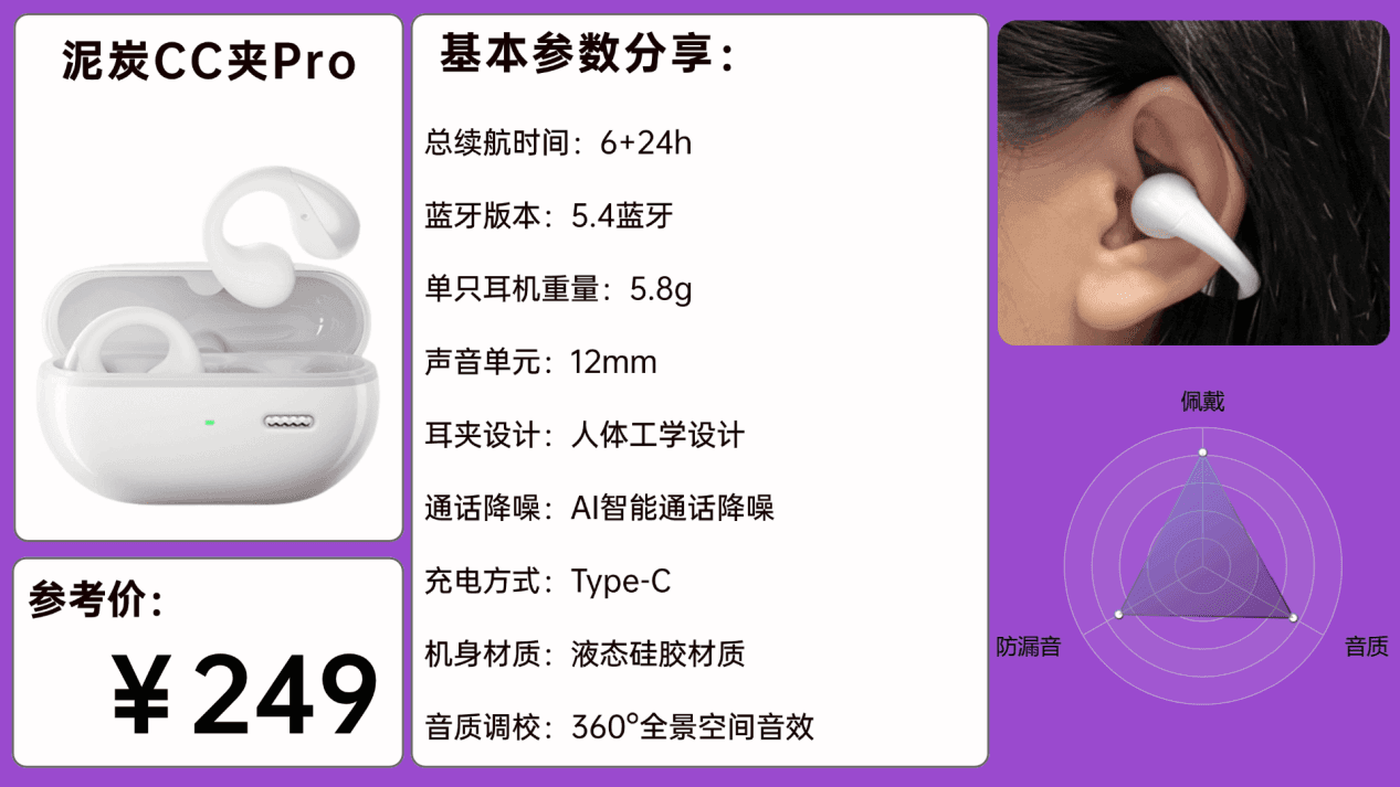 音质与防漏音评测:整体音质清晰度有待提高,播放音乐时偶尔会有声音模糊的情况,高频不够明亮,中频人声缺乏立体感,听感偏平淡。漏音问题较明显,音量超过50%时,1米外的声压级可达49dB以上,在安静环境下使用很容易打扰他人,对隐私保护也不够友好。配置性能评测:蓝牙连接基本稳定,在无遮挡的环境下不易断连,但传输距离稍近。续航能满足日常短时间使用,单耳续航5小时,搭配充电盒总续航18小时。防漏音设计不足,公共场合使用体验一般,适合对音质、稳定性要求不高,仅用于偶尔听播客、接电话的用户。6.泥 炭C C夹P r o耳机