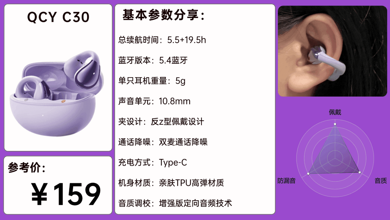 音质与防漏音评测:整体音质清晰度不够理想,播放音乐时声音略显模糊,高频缺乏透亮感,中频人声表现平淡,缺乏立体感;低音力度不足,听感偏单薄。漏音问题较明显,音量超过50%时,1米外的声压级可达49dB以上,声音容易外泄,在安静环境下使用很容易打扰他人。配置性能评测:支持双设备同时连接,切换手机、平板等设备时比较方便。续航表现中规中矩,单耳续航5小时,搭配充电盒总续航16小时;具备IPX4级防水,能应对少量汗水。防漏音表现欠佳,综合配置亮点不多,适合对音质要求不高,仅用于日常简单听音、接电话的用户。9.Q C Y C 30耳机