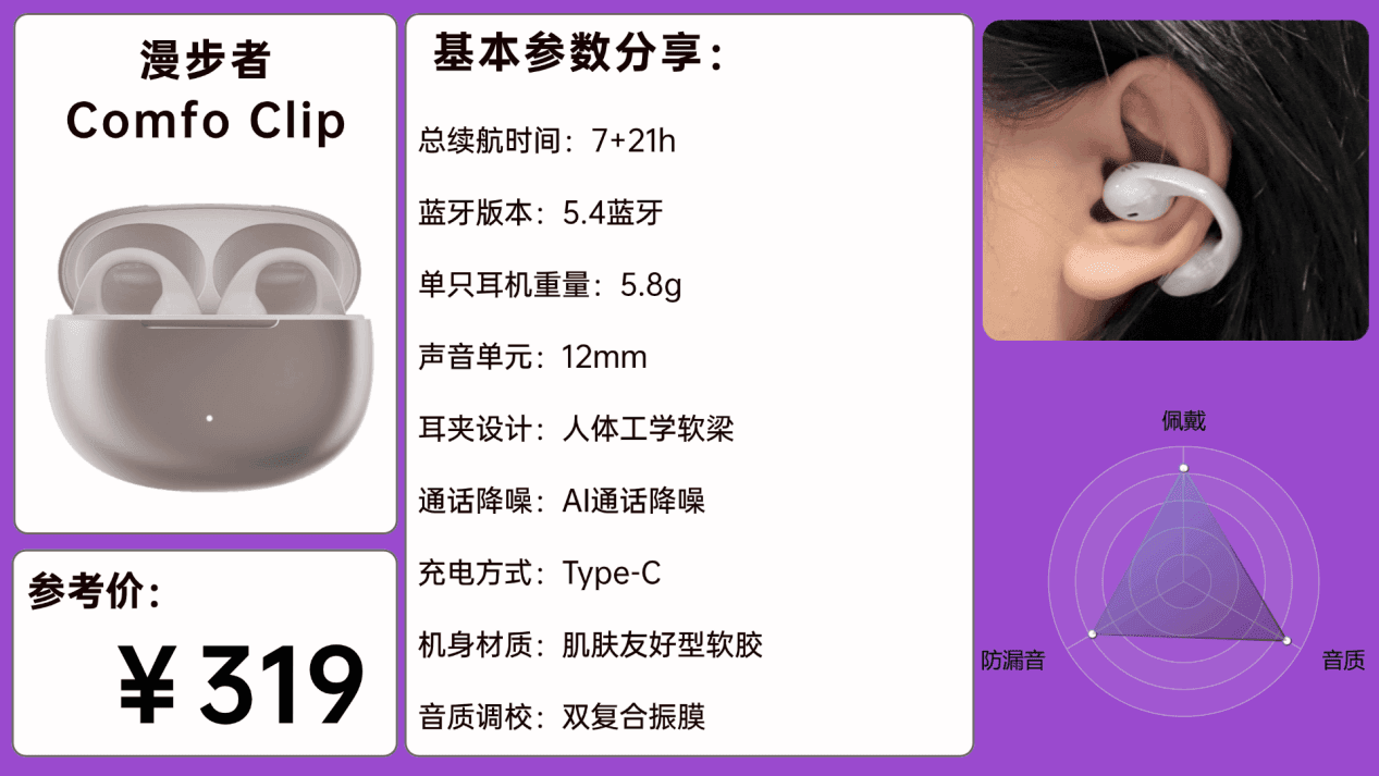 音质与防漏音评测:运用Bose OpenAudio开放式音频技术,声音深沉醇厚,细节还原到位;通过传感器与声学结构的配合,能在传递高清声音的同时兼顾外界环境音,保证使用安全。但防漏音表现欠佳,在安静环境使用时,音量稍大就容易干扰周边的人,更适合在轻度嘈杂的环境下用。配置性能评测:蓝牙连接稳定,几乎不会出现断连情况。电池续航持久,单耳续航7小时,搭配充电盒能满足全天佩戴使用。虽有品牌声学底蕴加持,音质表现亮眼,但声音密闭性设计不足,当背景噪音≤30dB时,漏音会比较明显;支持快充,充电10分钟可用2小时,耳机仓设计精致,单手开合方便。4.漫 步 者Co mf oC li p耳机