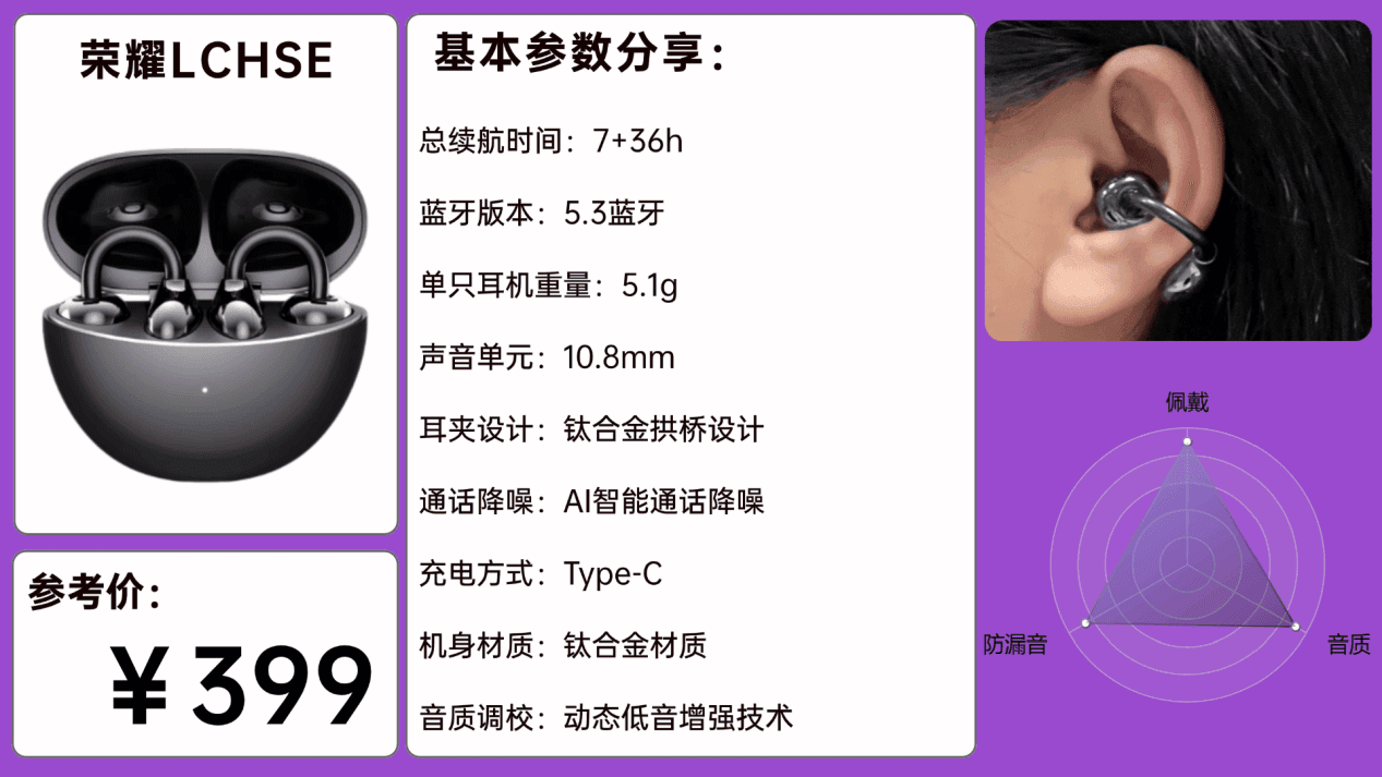 音质与防漏音评测:音质整体清晰度不够理想,播放音乐时声音有时会模糊,高频缺乏透亮感,中频人声表现平淡,缺乏立体感;低音下潜较浅,听节奏感强的音乐时不够有劲儿。未搭载高阶防漏音技术,仅通过基础音腔设计控制漏音,在常规公共场所,音量不超60%时漏音不会影响他人,音量再大则漏音明显。配置性能评测:蓝牙连接较稳定,日常室内使用基本不会断连。续航满足日常基础需求,单耳续航6小时,搭配充电盒总续航20小时。价格亲民,适合预算有限的用户,能满足日常听歌、接电话等基本需求,但细节处理稍显一般,比如触控反应偶尔不够灵敏。7.荣 耀LC H S E耳机