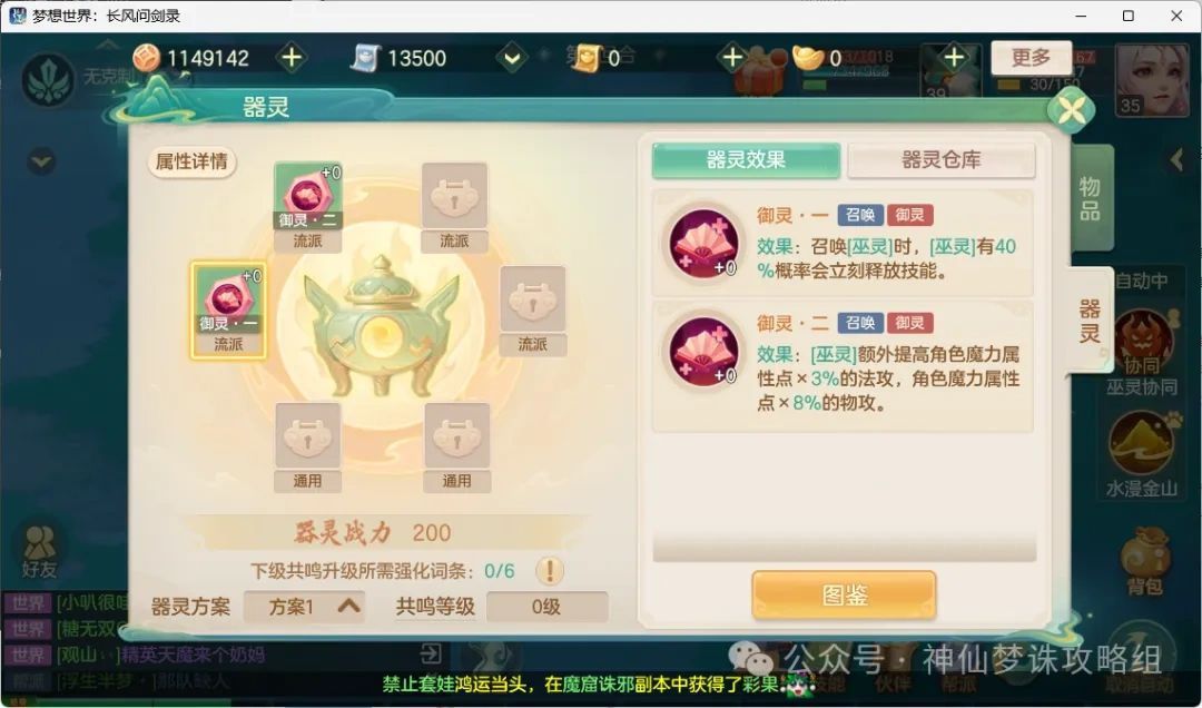 作用:提升招式效果,每个器灵有专属效果和词条属性,升级可增加词条数量。