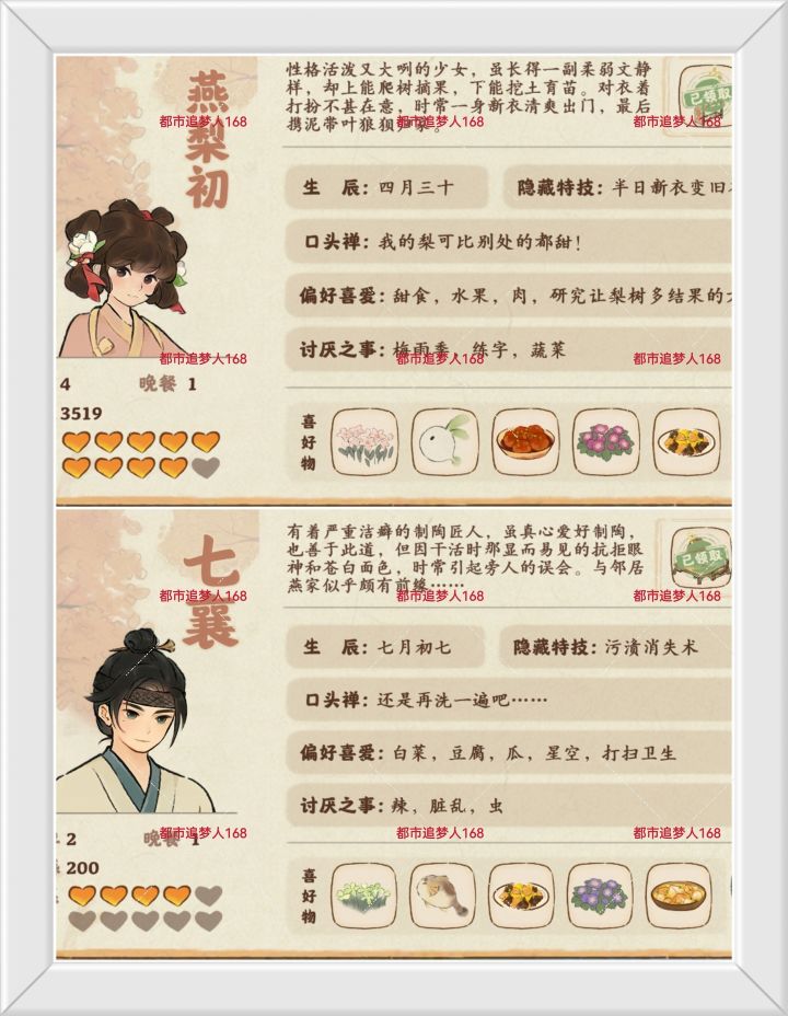 桃源新村民喜好物攻略、燕梨初、七襄、燕楸