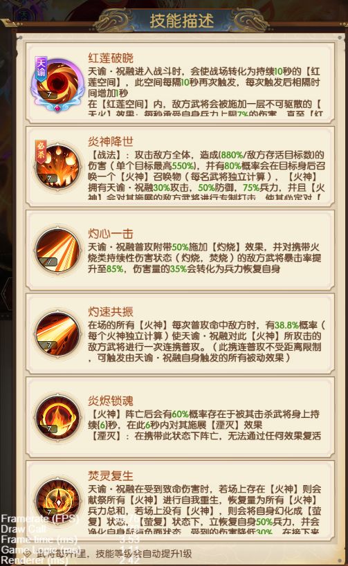 ❶【红莲破晓】展开【红莲空间】,领域之内敌军持续焚血,每秒承受最大兵力7%伤害,叠加不可驱散【天火】效果,灼魂蚀骨!