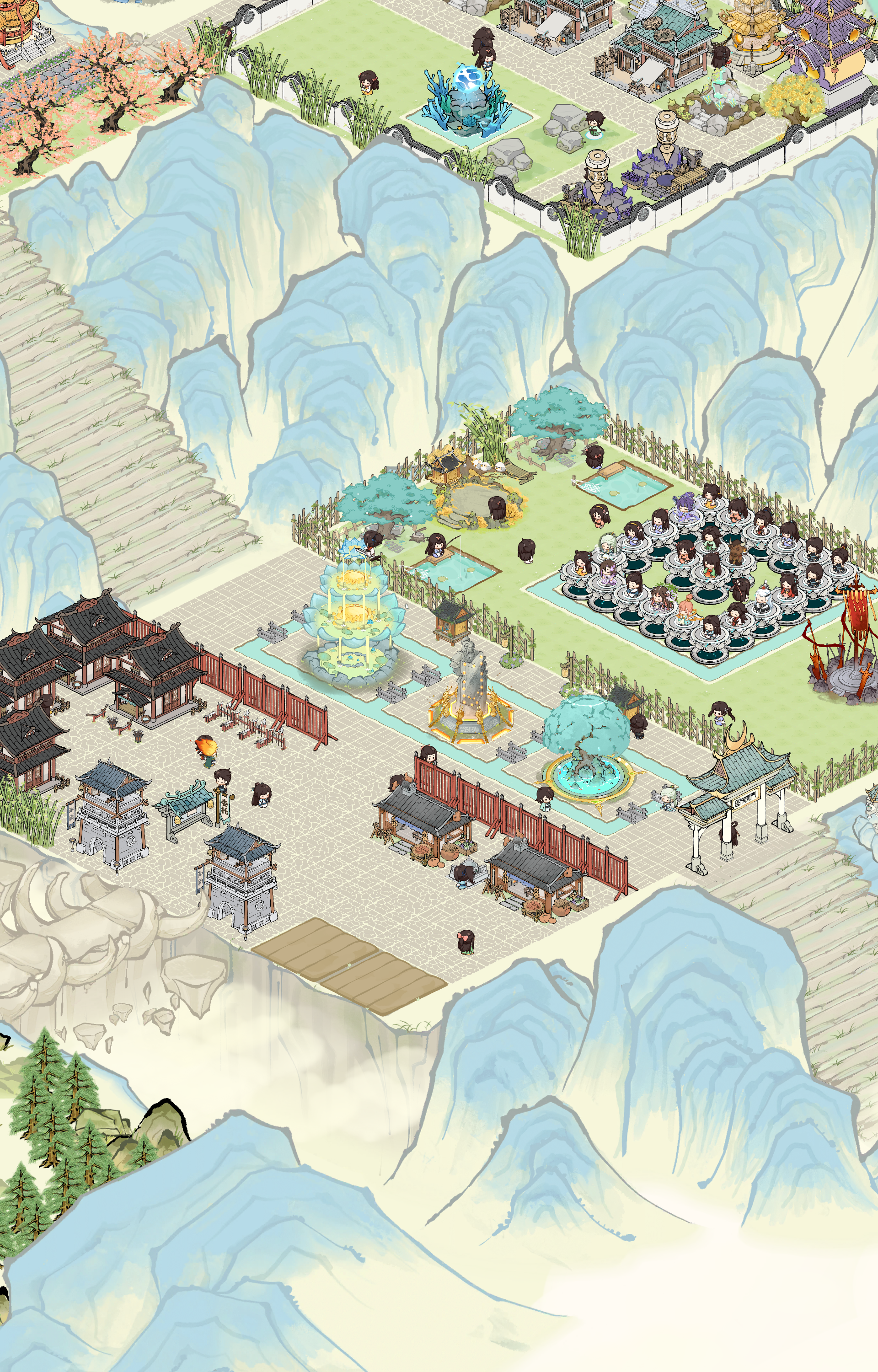 搞了两天还没弄完,剩余的只能等地块全解锁再规划了。弄了大殿,婚宴,财神庙,炼丹区。炼丹也只弄了半个,其余的基本都是半成品,就等官方新出一些建筑,和开放等级解锁地块了。