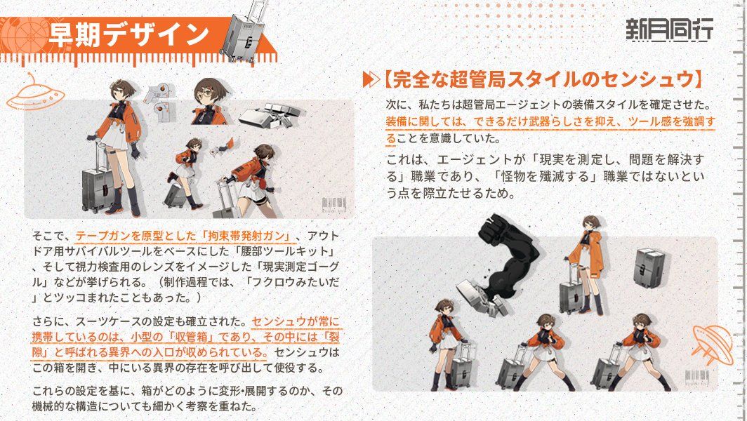 此外,行李箱子也确立了设定:千秋随身携带的小型收管管箱,里面收管了一个名为“裂隙“的异界入口。千秋会粗暴地砸开箱子,使唤里面的异界存在。在这些设定基础上考究了箱子变形展开的机械机构。