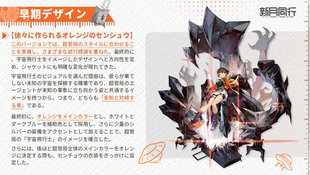 最终我们决定以橙色为主色调,白色和深蓝色为辅助色调,加上少量银色的装备做点缀,确定下来超管局的宇航员印象感。包括后来超管局要把橙色作为主色调,其实都是从千秋衣服颜色来反哺确定的。