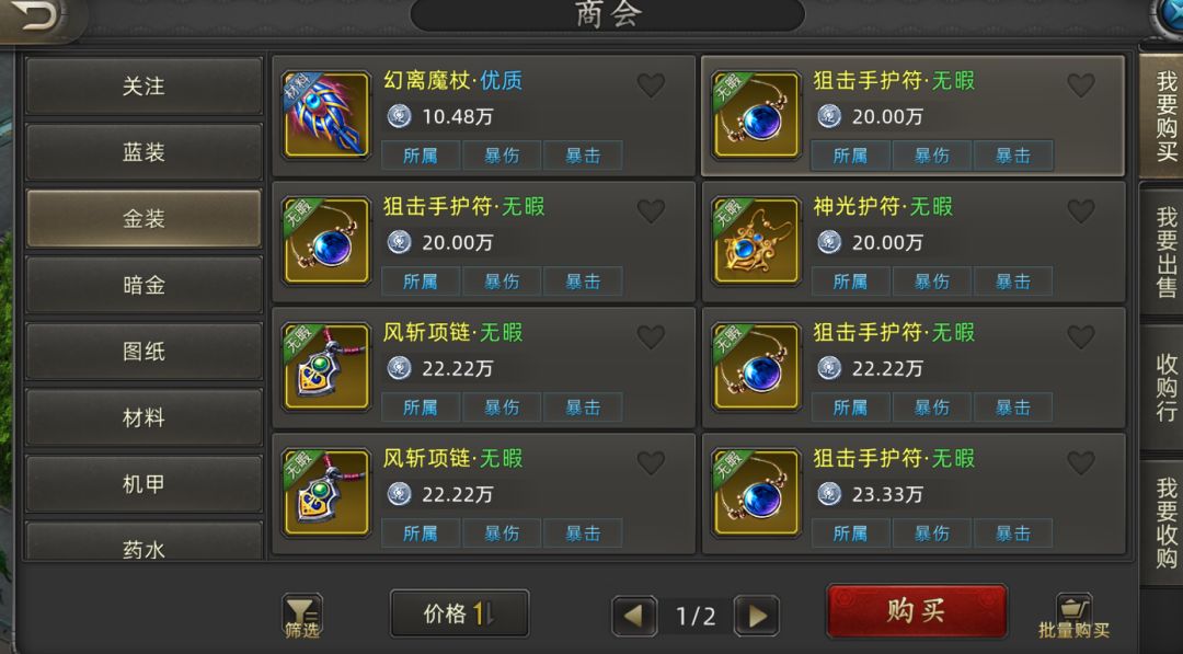 暗金不一定比金装牛: 这点很多新玩家不懂,有些垃圾词条的暗金装备,卖得比极品金装还贵,纯属坑人。多看看属性对比,别光看装备品级,咱们需要花钱在刀刃上。