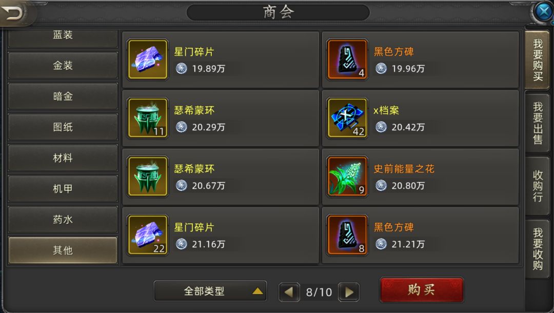 有时候你急用钱,或者背包里一堆乱七八糟的材料懒得一个个挂,怎么办?可以直接用收购行秒卖换成银币。但记住,这个价格肯定是偏低的。如果你不急用钱,我还是建议你老老实实挂商会,能多挣不少。