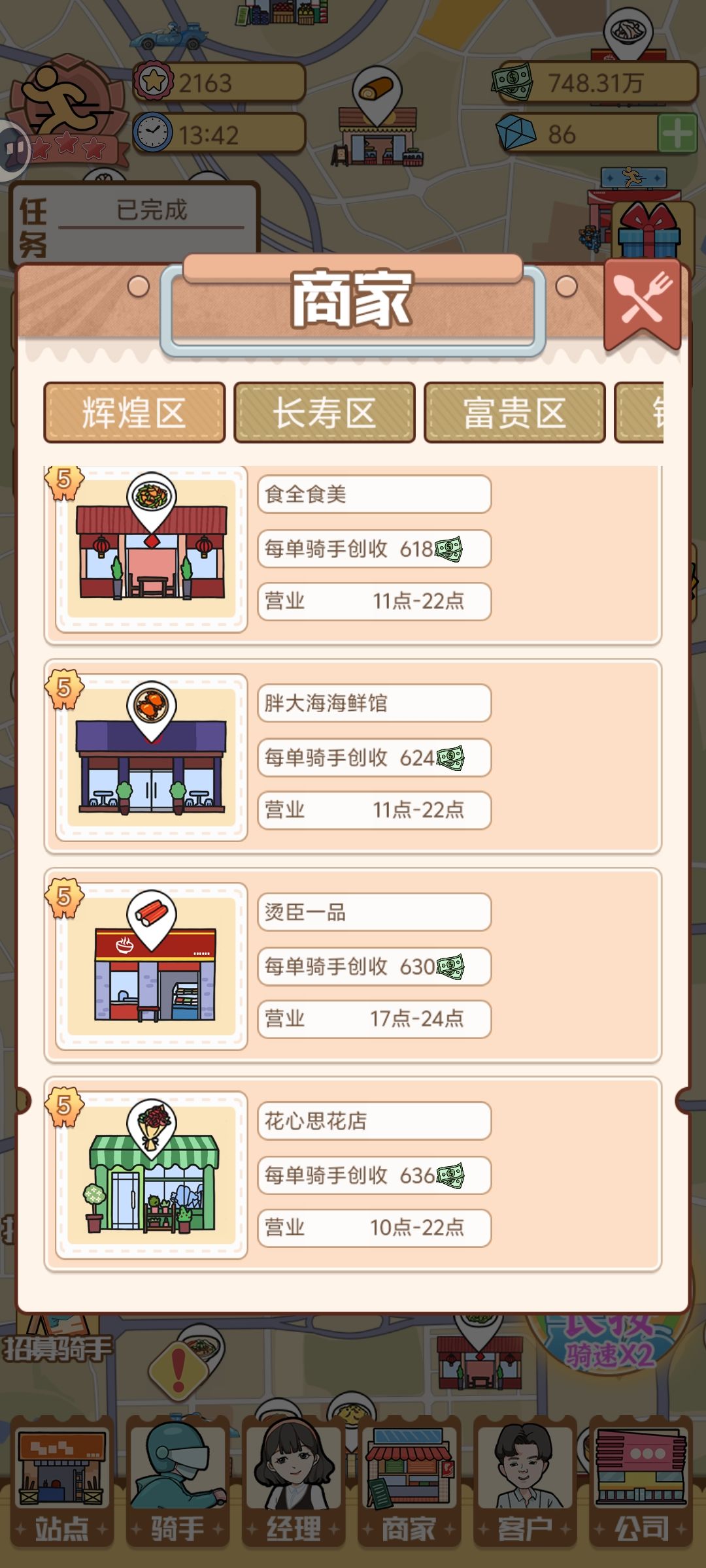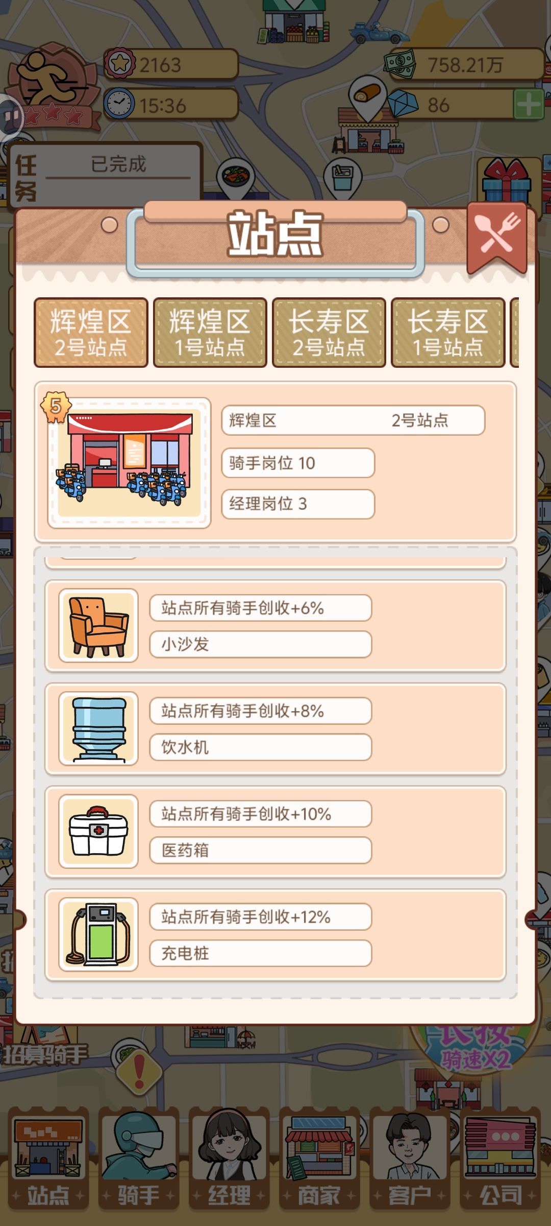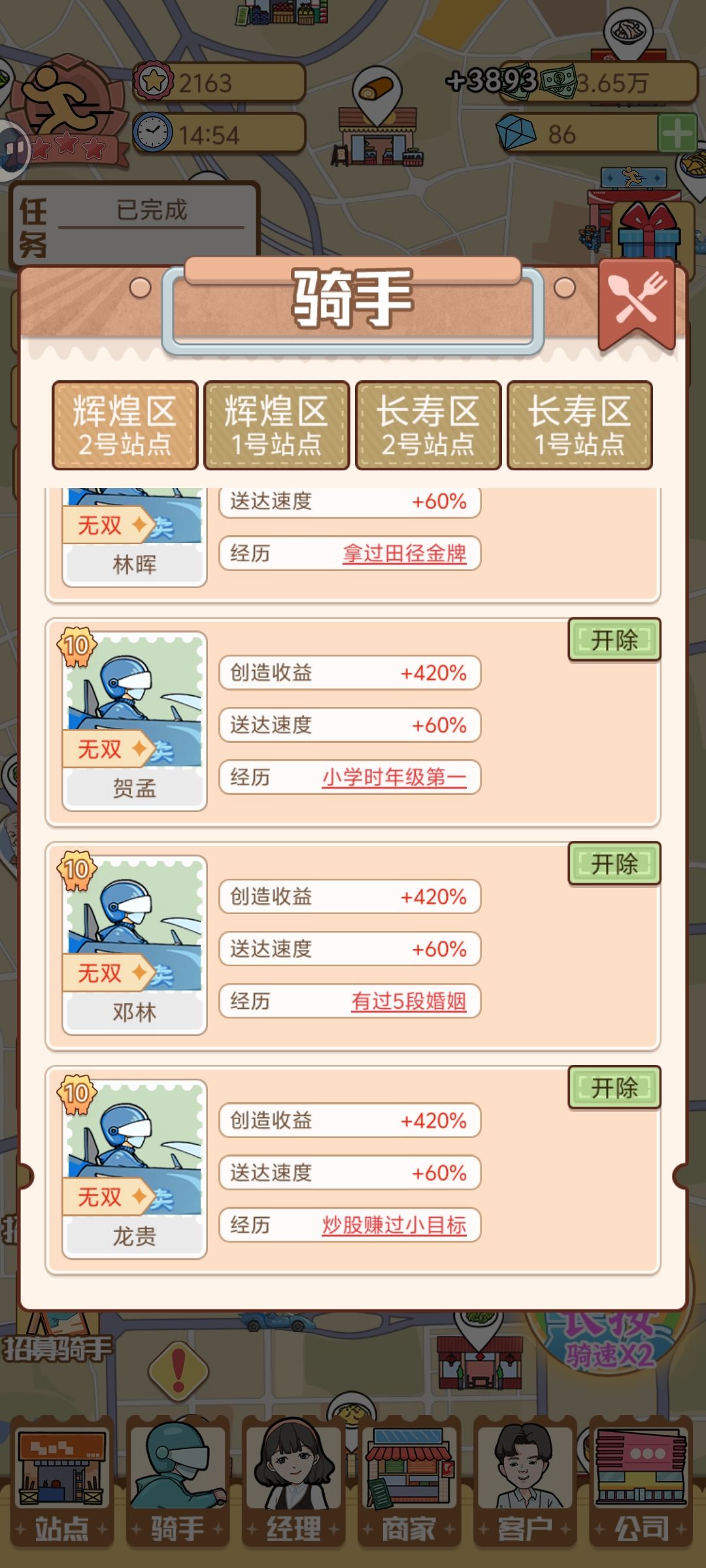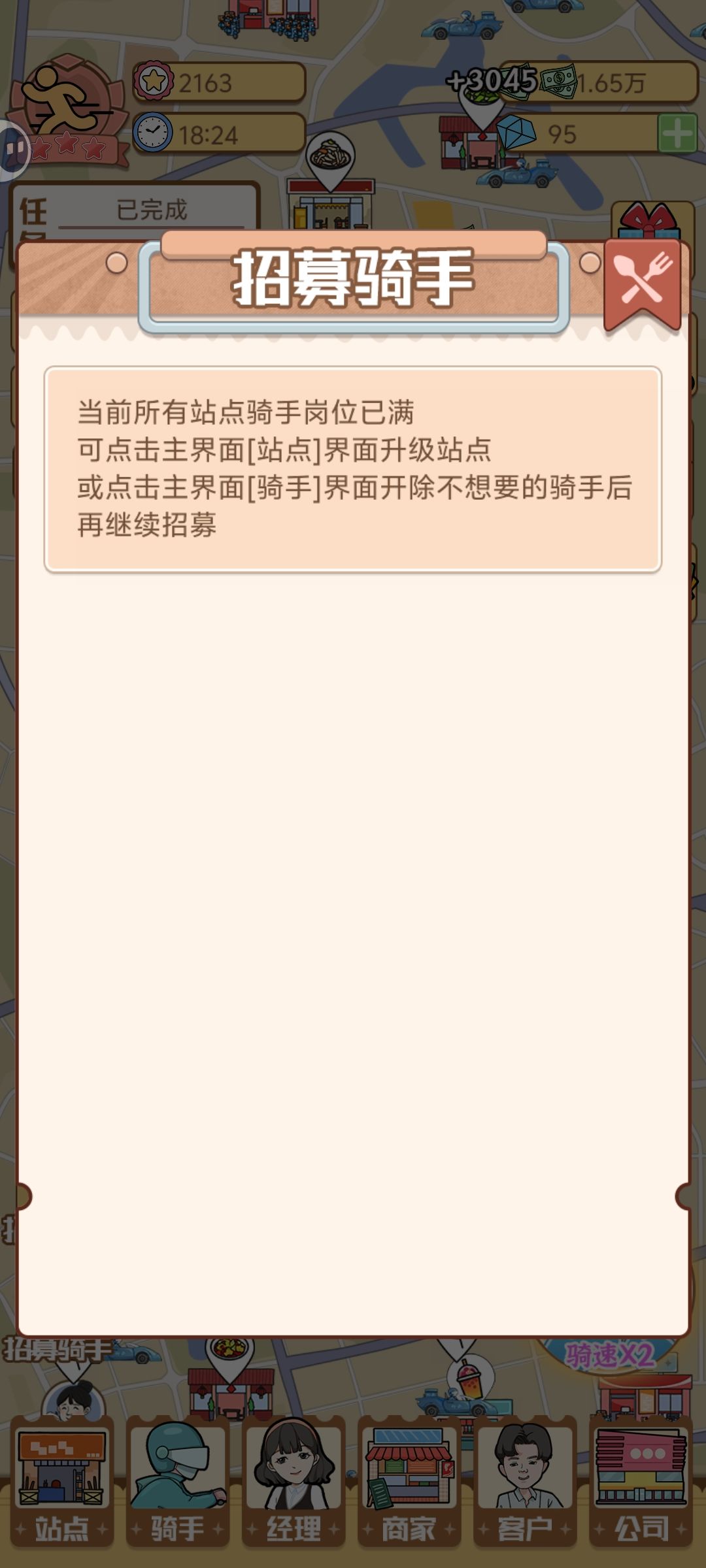 最难刷的是骑手,全10骑手没有可能,最好的情况也一定会剩一个9,其余骑手全10,换车在当前非10骑手数<4的情况下不会刷出,整体游戏时长14小时左右,跳转wxxcx的广告可以通过建立手机wx分身解决,这样跳转到wx登录界面呆个15秒就行,下载的广告直接关闭重刷。满级收益一天100万钱(正常天气)