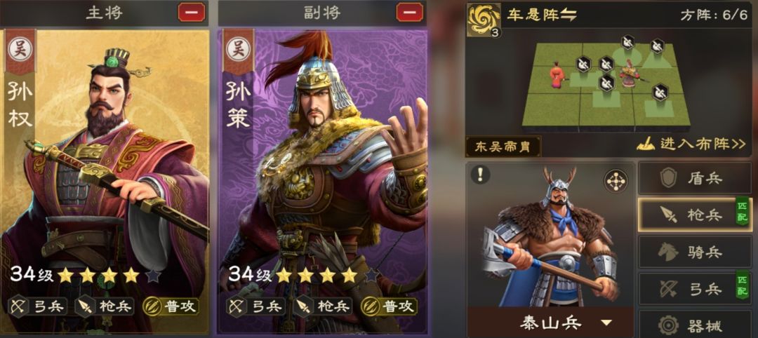 这队直接将孙尚香换成了孙权,作为大核心的孙权,获取难度就比较大,培养成本也高。不过给队伍的提升也非常大,孙权技能自带提升队伍暴击,就可以把增加暴击的雁形阵换成普攻穿透的车悬阵,再配合孙策暴击增伤,相比于孙尚香的暴击枪,伤害直接得到质的提升。同样也是适用于挑战25级以后的蛮族。