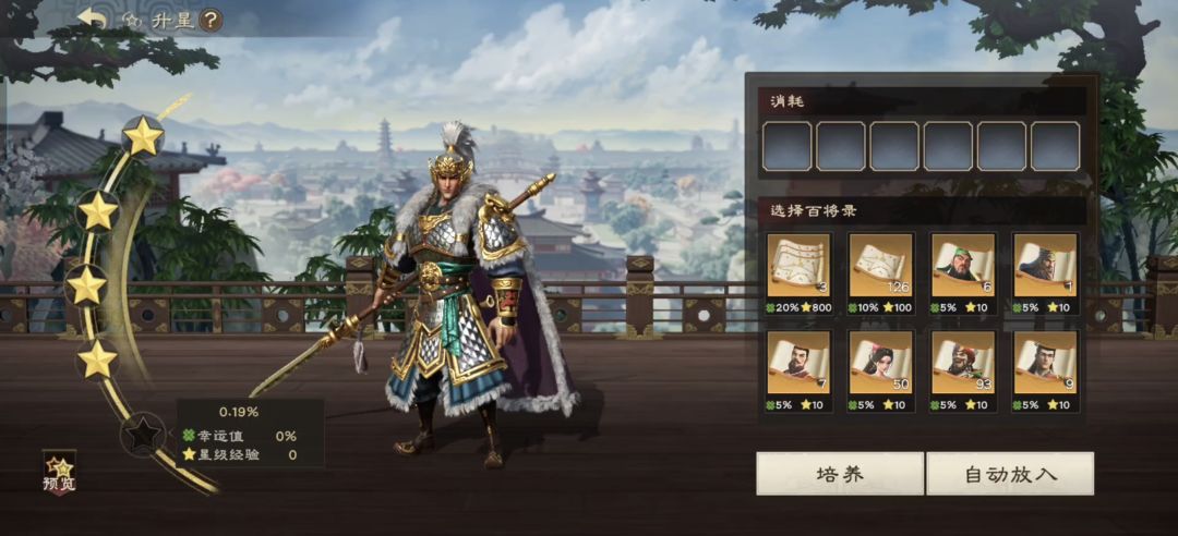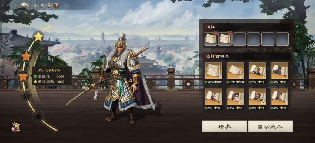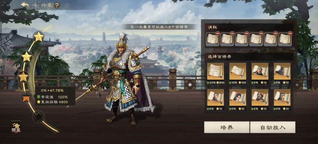 如果第一步没触发暴击,或者进行第二步后,就直接选择6张大百将录(一叠)即可直接升到4星。当然如果大百将录不够的话,小百将录也可以用,不过就是得控制好幸运值比例和多次尝试。幸运值越高,暴击的的概率越大。