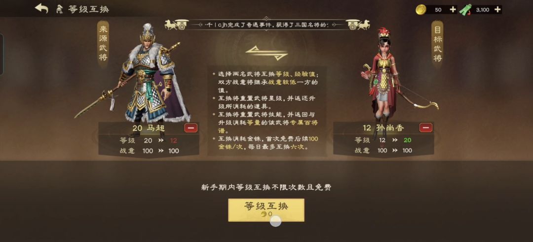 如果第一步触发了暴击,就可以通过等级置换,将消耗的百将录返还,然后再重新对武将进行升星—等级置换两个操作,直到武将升星没被暴击。