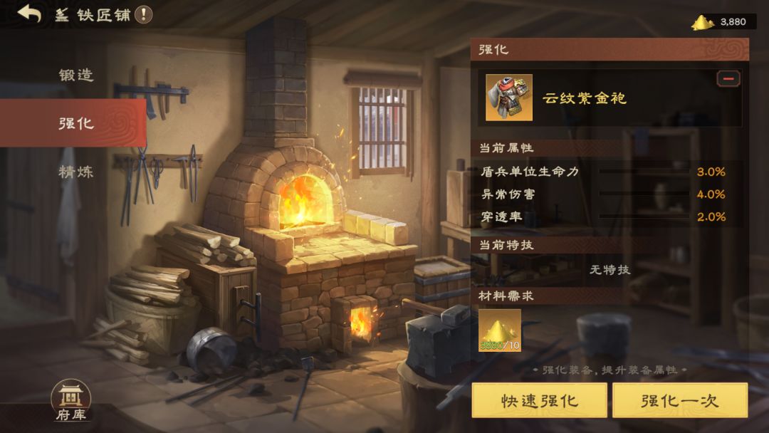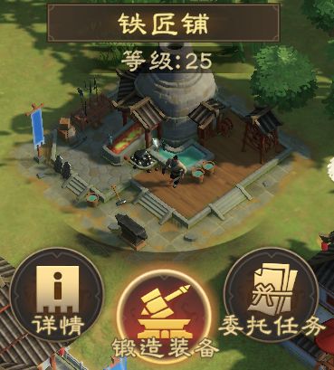在铁匠铺中主公们可以对装备进行锻造,强化以及精炼。主公还可以通过接受铁匠铺的委托任务,击败黑山首领或在商肆中购买等方法获取打造所需材料。