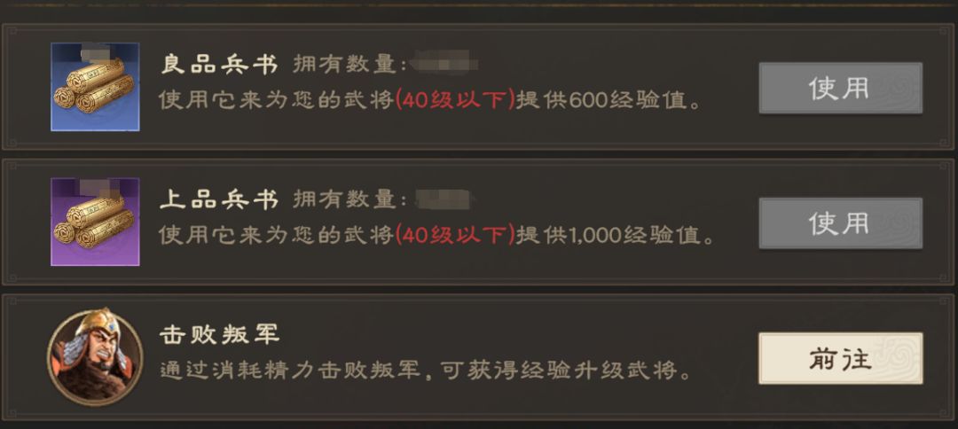 使用不同品质兵书以及击败叛军是各位主公获取经验的主要途径。
