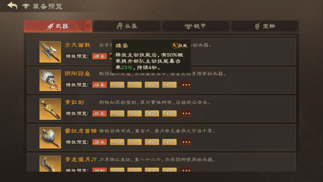 主公要根据不同装备的专属特技的流派不同来选择自己的培养路线。例如这里玩主动队伍的话,就可以优先培养方天画戟去追求雄姿特技。