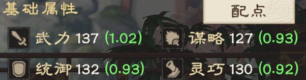 各项属性右侧()内是武将成长属性,随着等级提升,各项基础属性也会提升。且随着星级提升,主公会获得固定数量且可分配的配点。