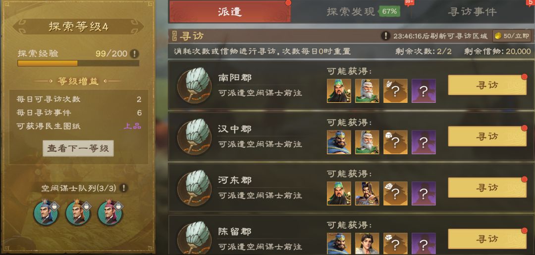 通过派遣谋士到指定的郡城寻访时,主公有几率获得固定武将。