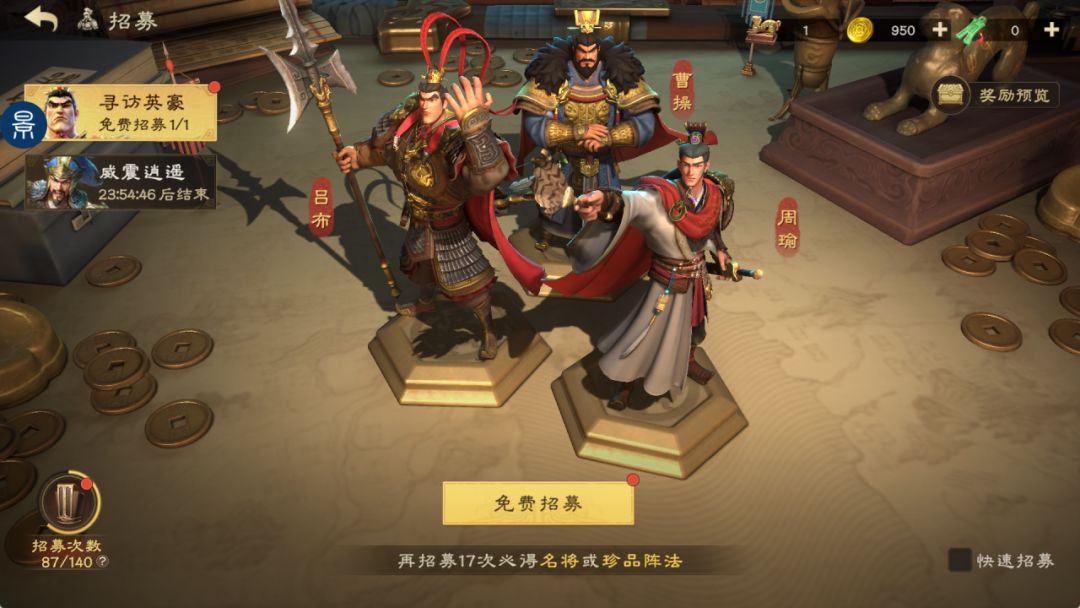 每天主公都会有一次免费招募和一次半价招募。