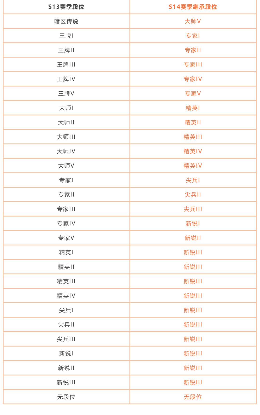 段位将在S13赛季结束后进行重置并继承段位,对应继承规则如下: