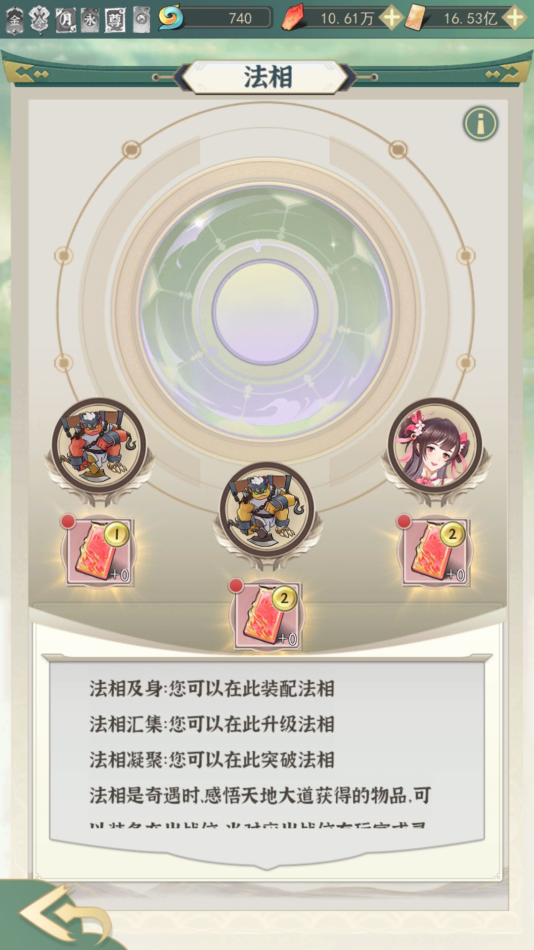 法宝:升级优先升级修为法宝,因为游戏里太白的获取很少,所以有些法宝可以不升级。