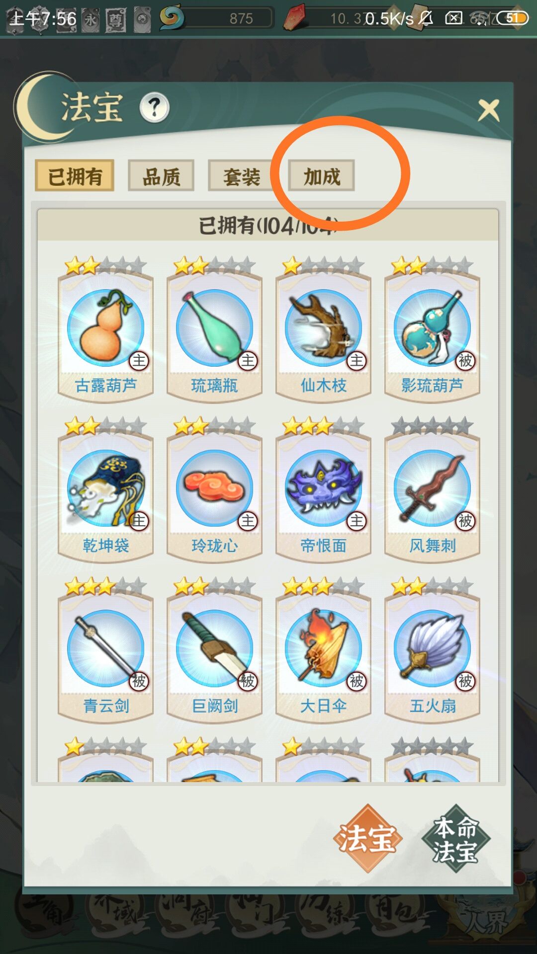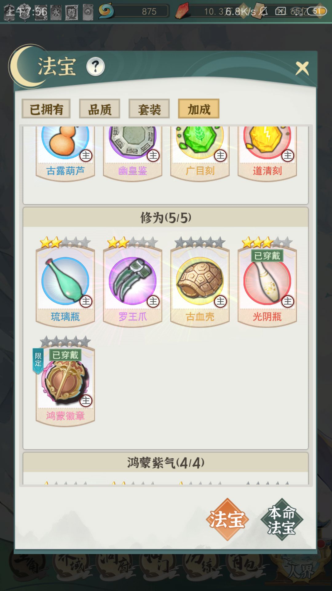 补充说明(图片):点开法宝界面里面有按加成筛选的,穿戴加修为速度的法宝如图