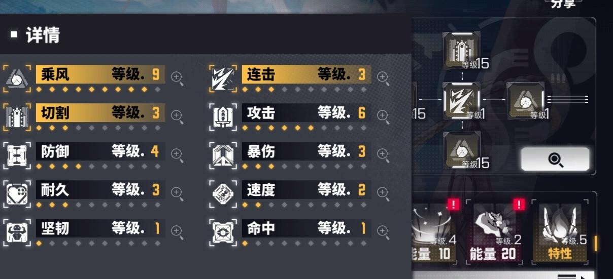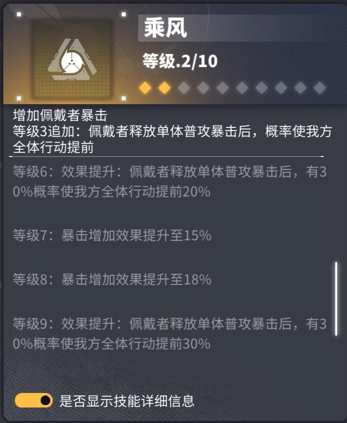可如果你的阵容需要乘风9呢?回到最开头那里提到的,攻击段数越高触发频率越高,穿乘风本来就已经没伤害了,自然是“能者多劳”,普攻段数多的角色多穿点乘风,其它角色就能少穿乘风,多穿点有伤害的芯片。要么选择乘风10找暴击词条,要么乘风9+连击3找暴伤稍微多打点伤害,如果追求9+3话需要连击乘风各有一个3级词条。