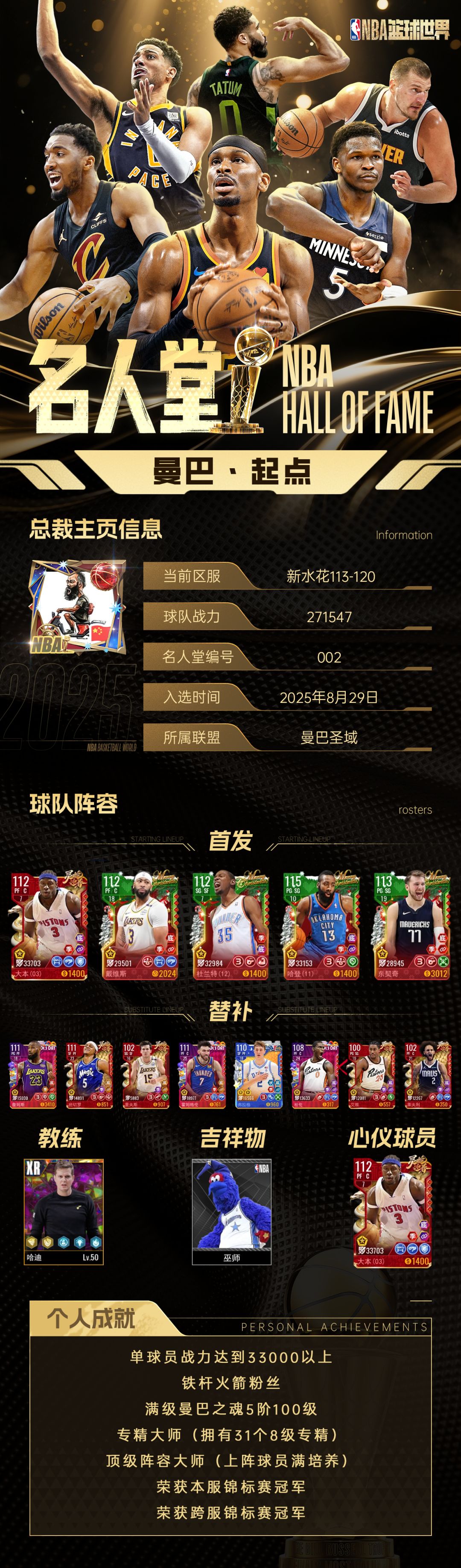 特大喜讯!恭贺新水花113-120区「曼巴丶起点」正式入驻《NBA篮球世界》名人堂!