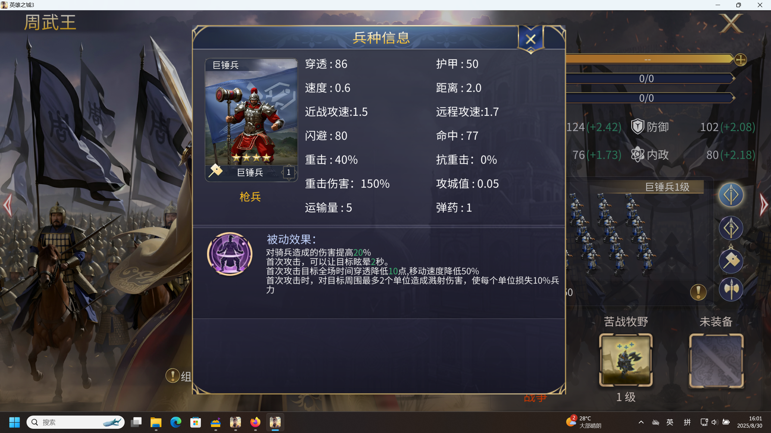巨锤兵,首次攻击可以眩晕,减甲,溅射,看着不错,但由于游戏战斗机制(每个将领所带部队分为多个视觉小兵,远程攻击经常会攻击同一个视觉小兵,控制,削弱类效果相当于只对该将领部队带兵的十分之一生效),实际效果一般