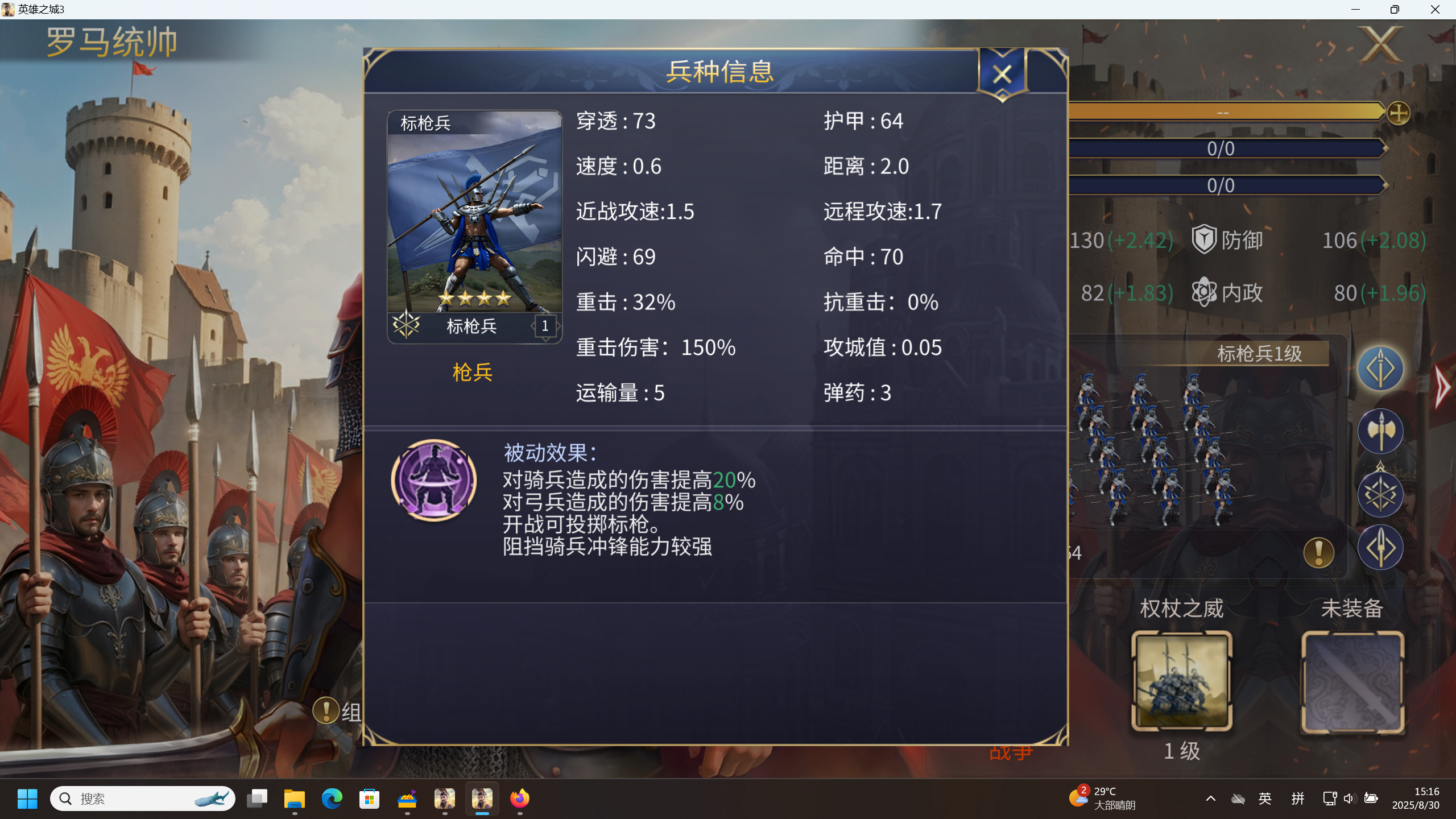 防御106(+2.08),对比老六星枪兵英雄,比六星英雄朱元璋98(+1.88)高出8个挤出点,比权力巨头91(+1.82)高出15个基础点,而且有更高的成长!结合基础防御值和成长值来看,在所有输出类步兵中,罗马统帅安东尼的属性极具优势。