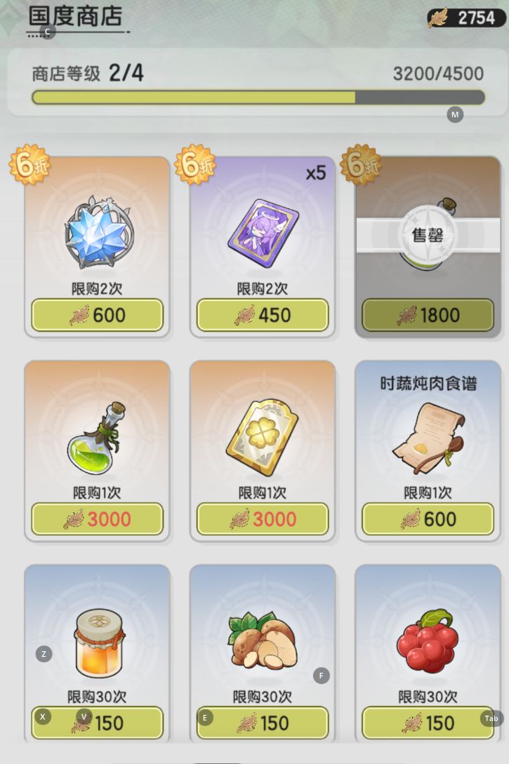 大家可以看到,国度商店开放等级根据你消耗对应的国度货币(比如森之国是丰饶之叶)而提升