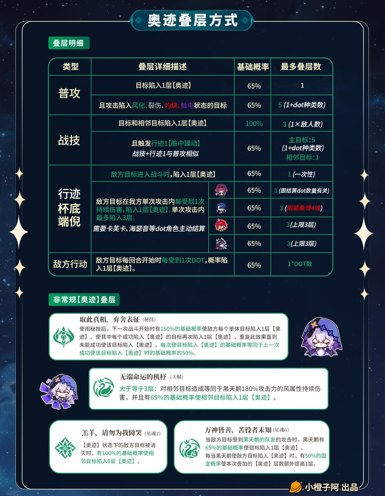 「黑天鹅」是一位风属性的虚无命途角色,也是DOT队伍的新成员。作为DOT角色,黑天鹅的机制主要依赖于天赋【奥迹】的叠层,大家可以把【奥迹】看做一个新类型的风化DOT。相比原有的风化,【奥迹】区别在于叠层上限高,叠层方式多,以及叠层后给予收益要远远大于风化DOT。