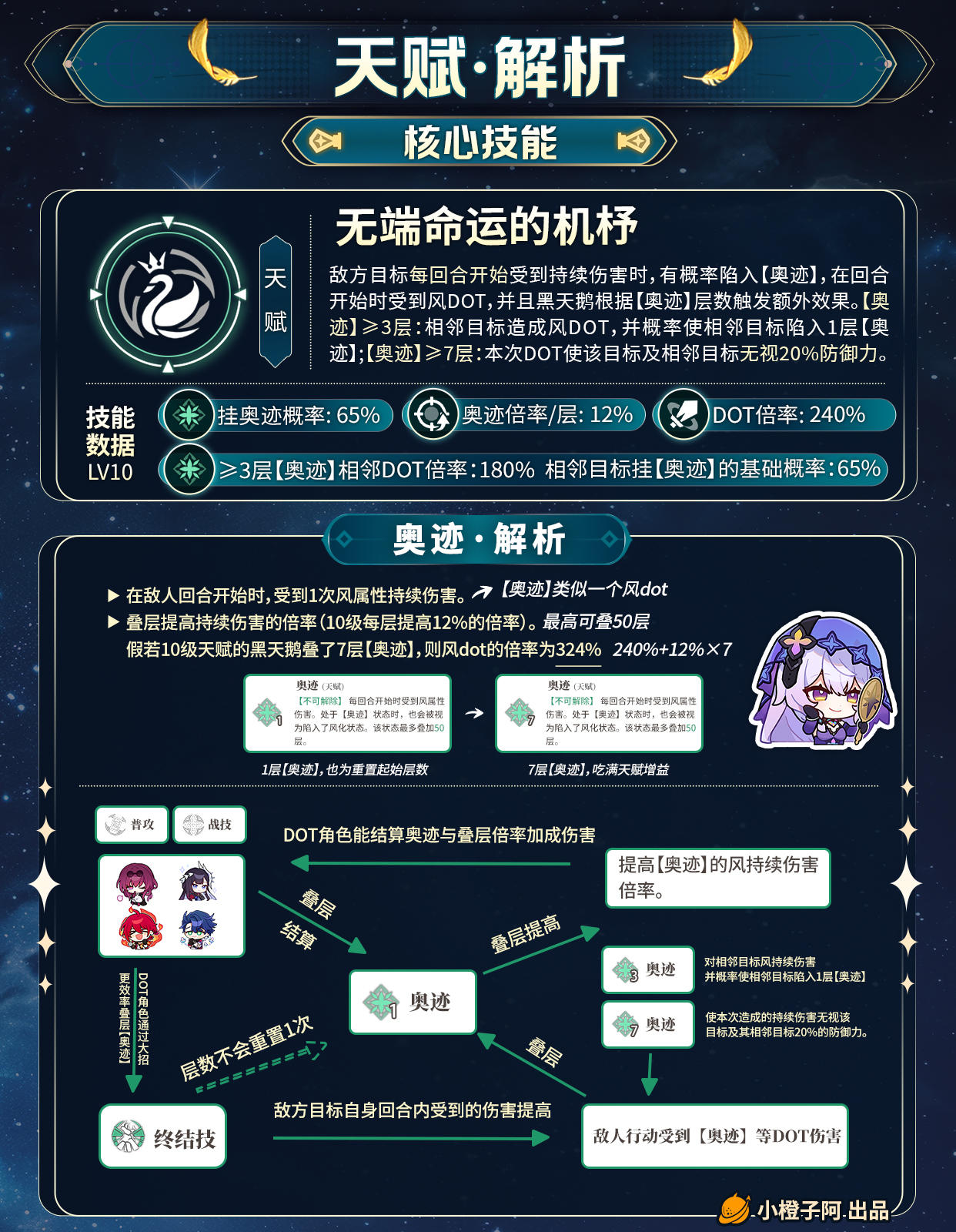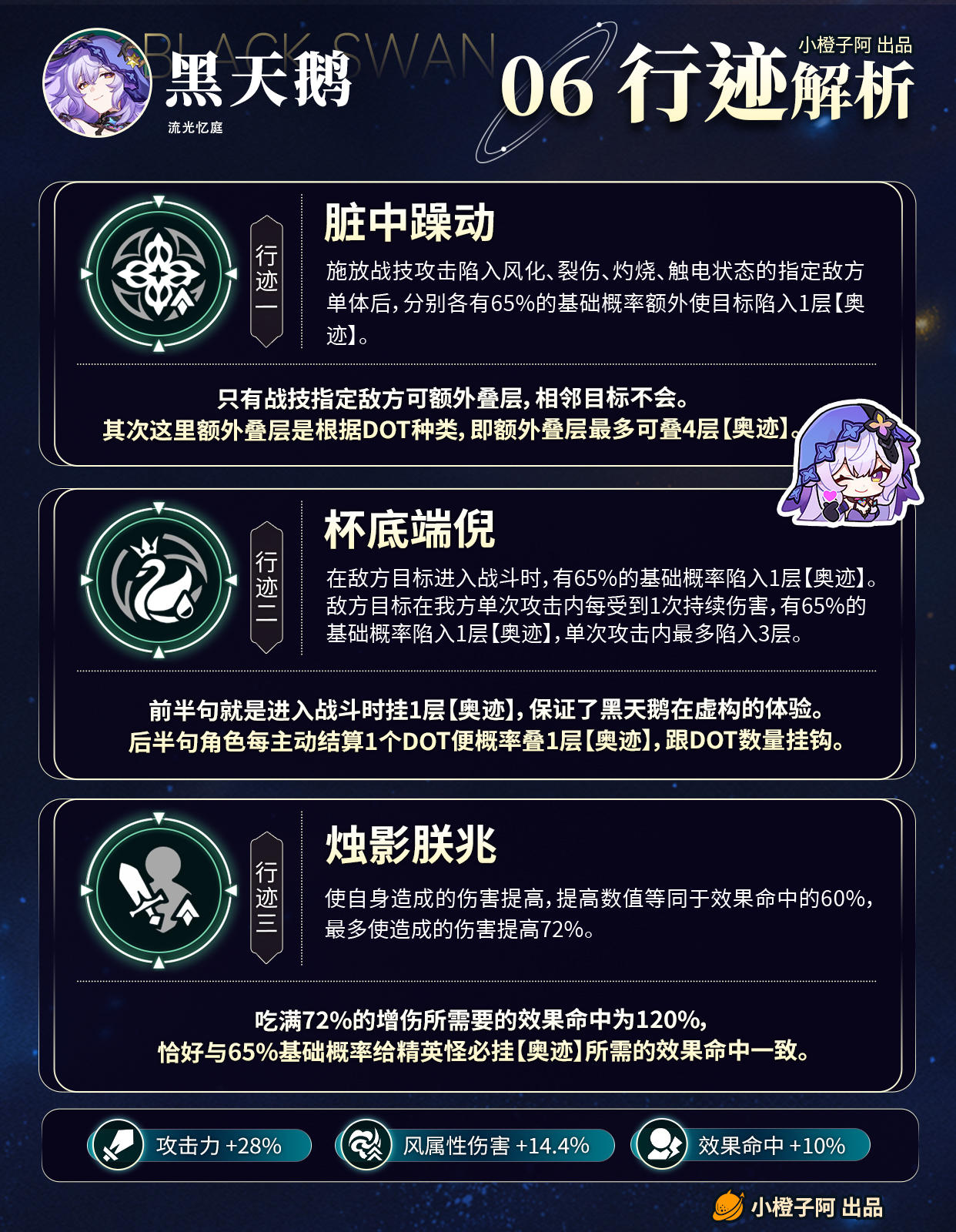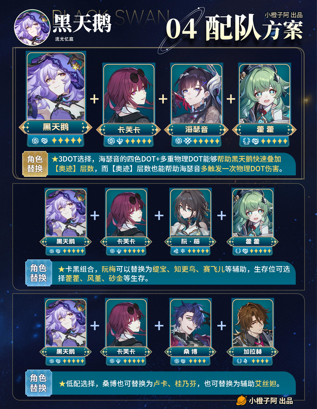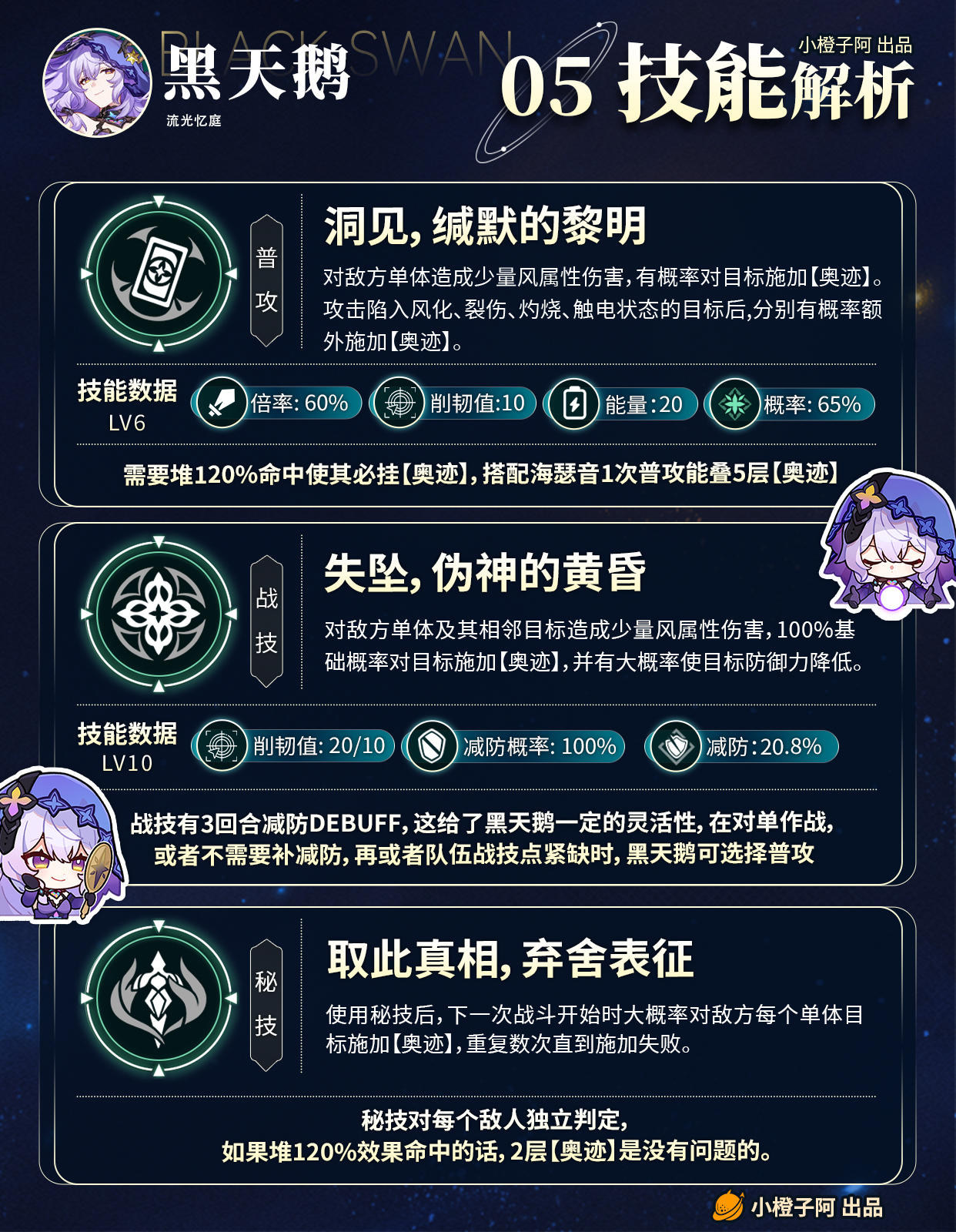 哈喽喽,这里是小橙子阿,本期是黑天鹅的角色攻略!本篇将用图文形式讲解黑天鹅的技能机制、光锥选择、星魂解析、遗器以及队伍搭配。