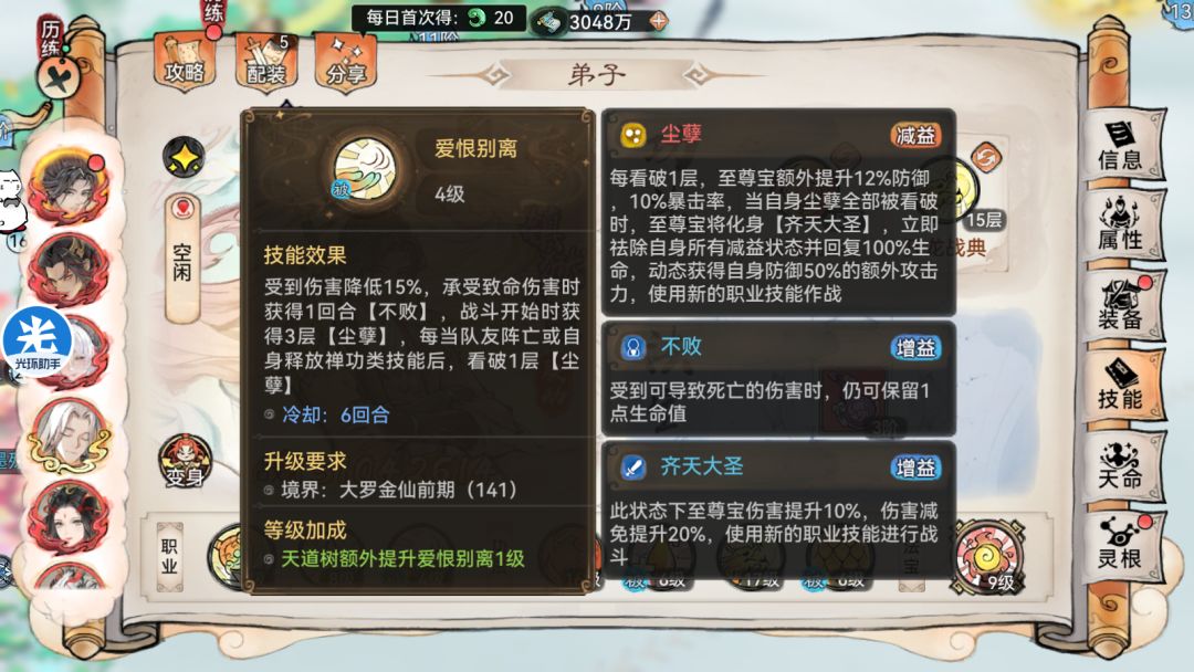 在法宝选择上,依旧是传统的金为主属性、叶子作为技能的方式进行法宝炼制,但在本命胚子的选择上有无常、养魂两种不同的选择。如何选择其实很简单的方式就是看自己的【至尊宝】会不会死,如果会死就选择养魂葫芦,死后复活会让其获得20%的攻击与防御属性,而这两种属性都会对【至尊宝】的输出有大量的提升。