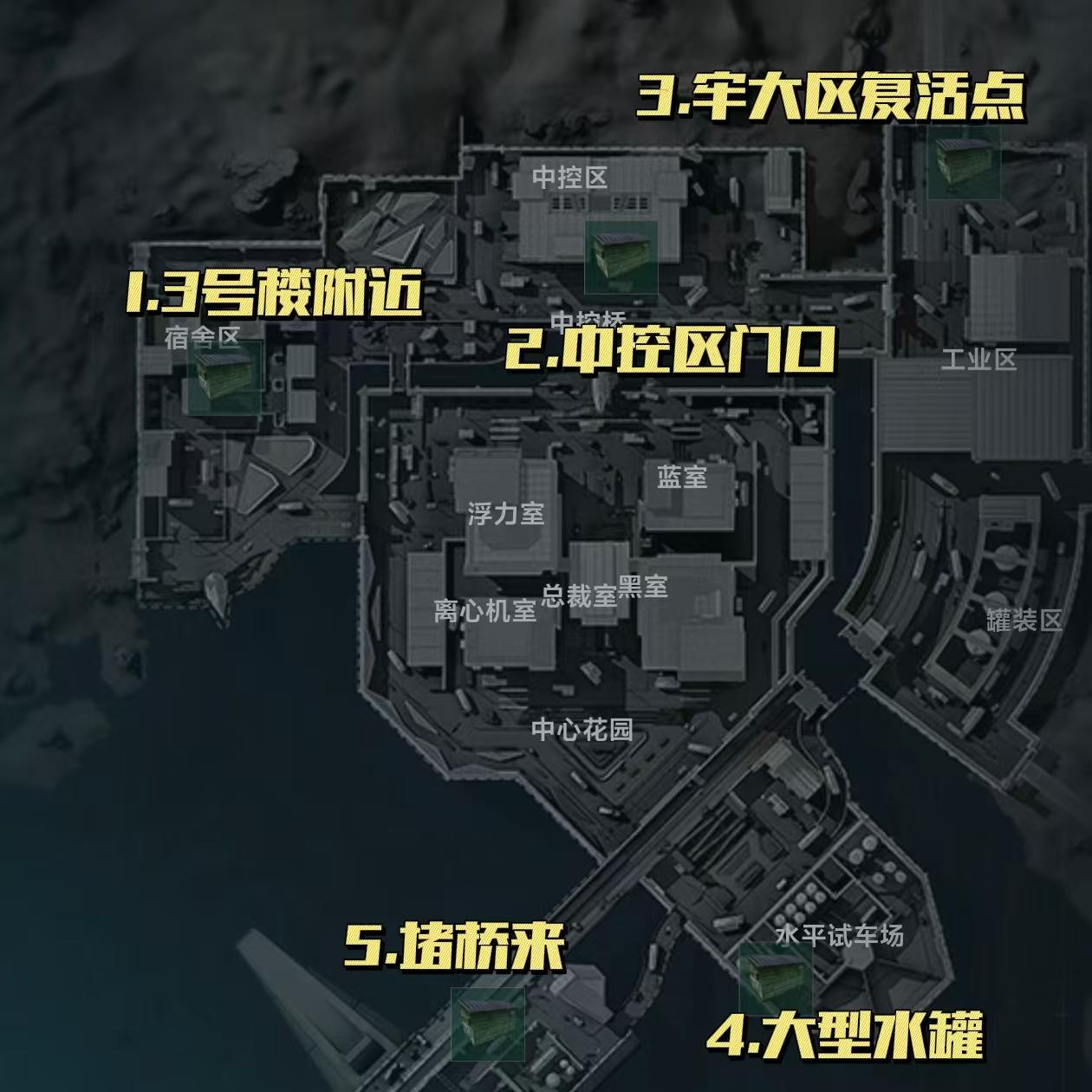 航天基地中垃圾箱1号点位就在宿舍区靠近3号楼位置;2号点位在中控区的大门口石墩旁的椰树旁边;3号点位就在工业区也就是大家经常说的“牢大区”复活点附近;4号点位在水平试车场靠近发射区那边的两个水罐附近;5号点位则在桥的内侧,前往搜索时要小心刷新在桥上的乌鲁鲁哦。