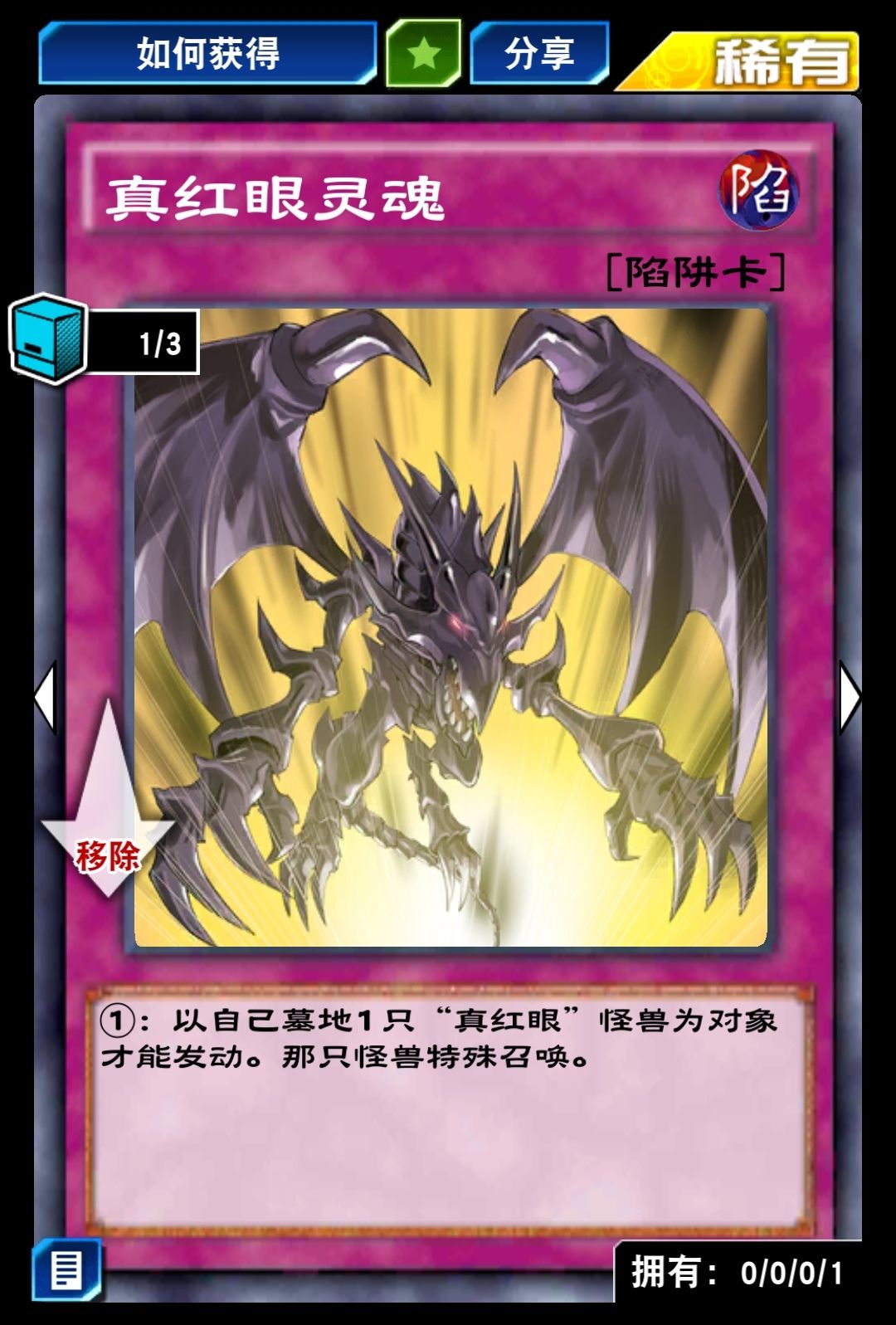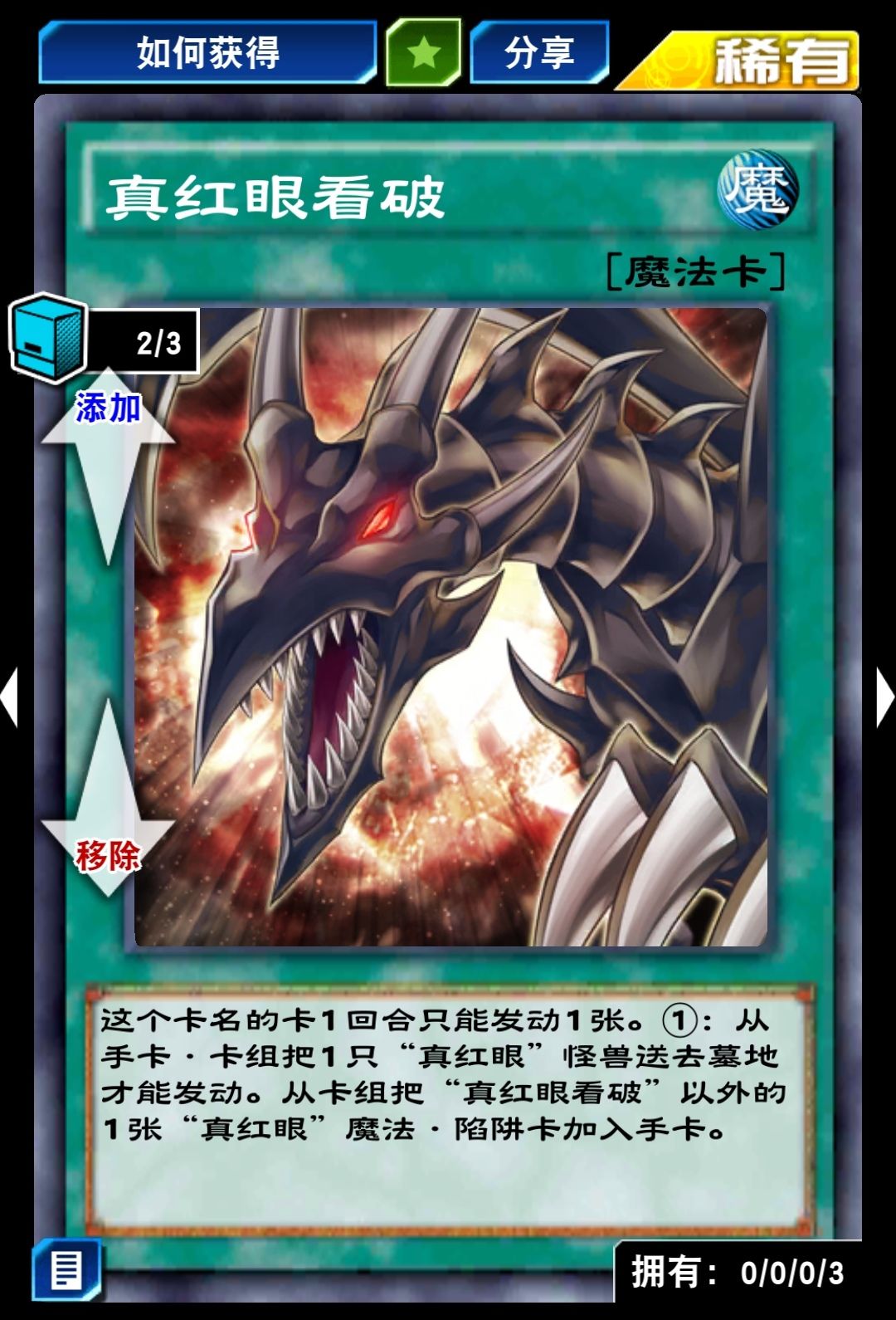 真红眼飞龙可以在心灵迷宫城之内闯关兑换第二张,除了真红眼看破和真红眼灵魂要用稀有兑换券兑换,其余的都可以用钻石购买,且凑齐不需要花费太多时间,只有龙破坏之剑士这张卡需要比较久,但也可以用卡盒芯片兑换一张,要是运气好的话,几下就抽出来了,成本不过几千个钻石。前提是你运气好!祝你好运!