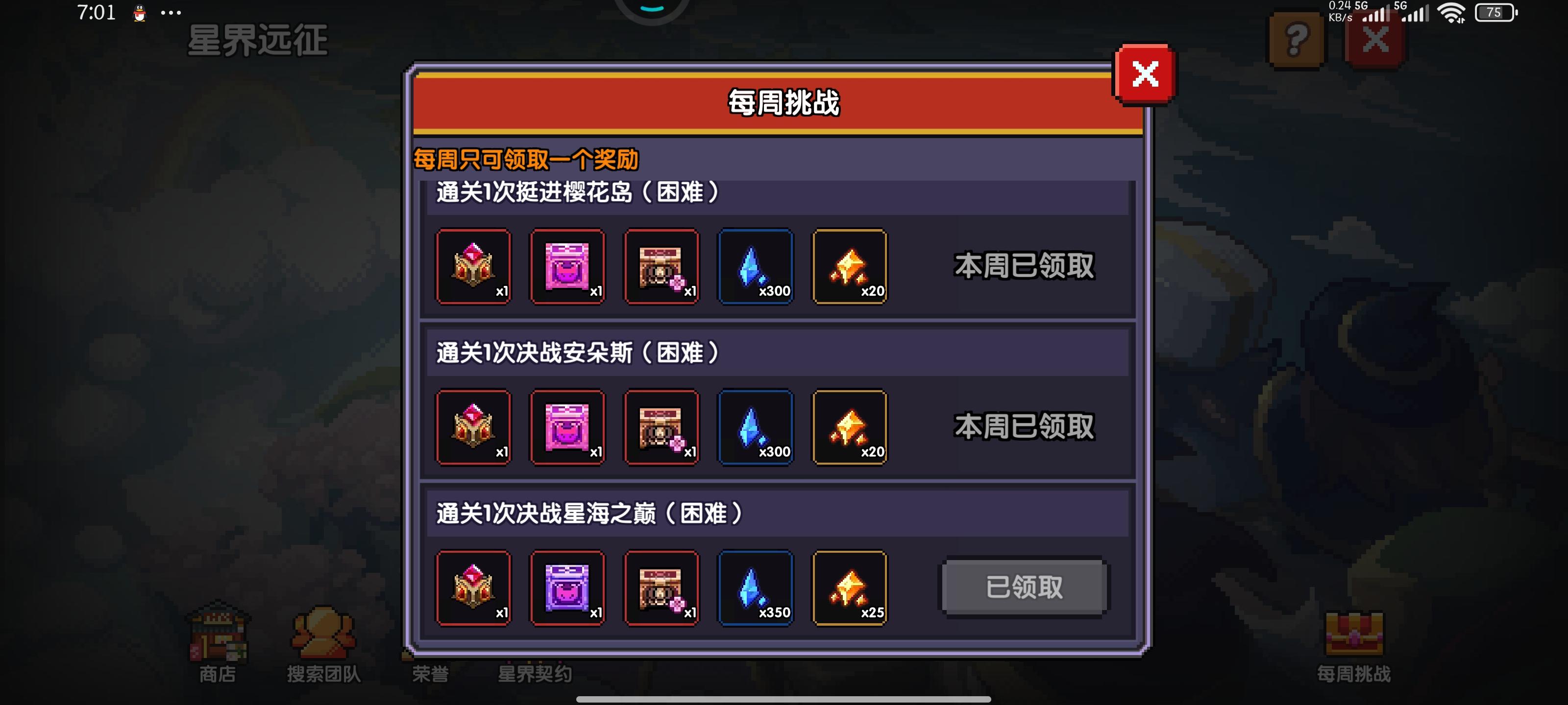 每周打完一次任意副本的困难模式,可以选择对应的每周挑战奖励,推荐选择决战星海之巅的奖励,奖励比较丰厚#我的勇者