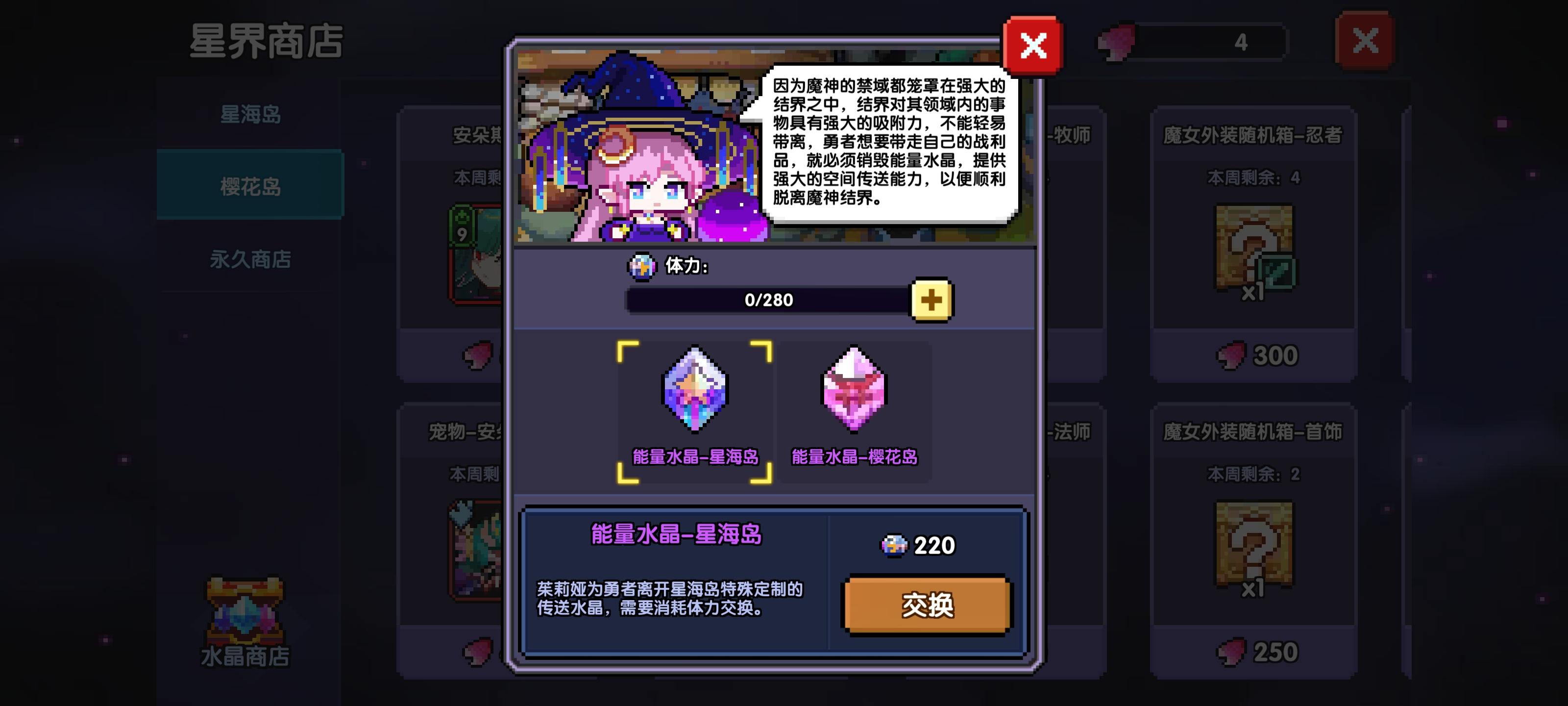优先选择打星海岛的困难模式,因为星海岛的外装是最新的,加成更高,如若是较为缺少演变之灵的话,每周预留480体力,分别换取星海岛和樱花岛的能量水晶,分别兑换对应商店的演变之灵,如果选择樱花岛进入,记得在队友被困住之时进行解救(不救的话会打的更久,而且你会挨骂)