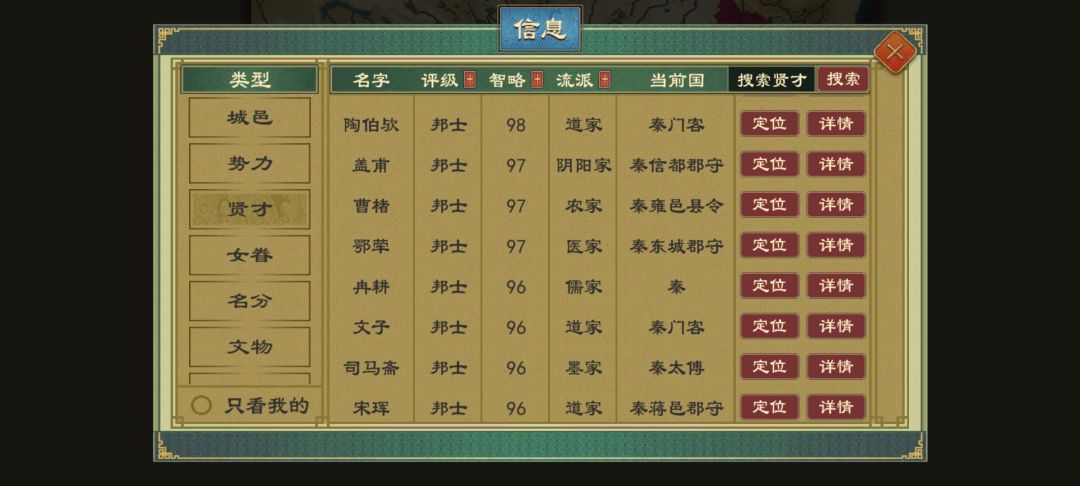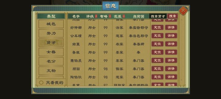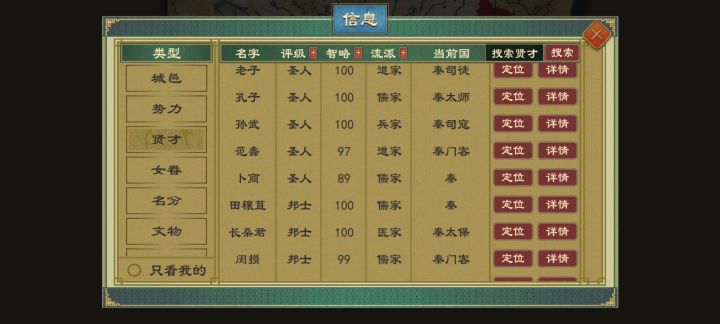 前期发育成型后会很简单,人才在后期根本不缺,共有城市1141座有海上路线能攻打海南岛并占领三韩地区小岛两个,南方地区很好打但不要托太久,后期我遇到了一个国家将南方统一了大半,西藏地区也好打但路远,修一个城少则30个月,多则50个月,卫国好打前期但是容易被鲁国以消除开战。秦国先打西边,东边晋国会打你。晋国开局有两个小国来攻打但之后发育很快。燕国有人口大城三个小弟和一个对手并且北边以燕国实力可以在中前期拿下。齐国先发育后可以从东方莱手中拿下济北再宣战中原。吴国将几个越拿下后可以多路选择进攻,因为周围较弱。楚国除了北方中原外东南西都能打。做为周天子前期打的较少只有南方两个小国打,可以在中前合邦西边小国,有能力了合邦卫国就好打了,但要会削封不然会被背刺打不过。