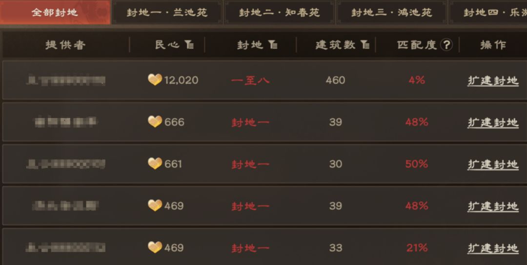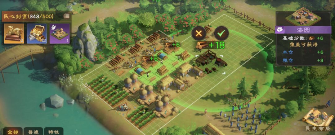 解锁封地后,可在封地中摆放各式建筑获取民心分数,如下图。