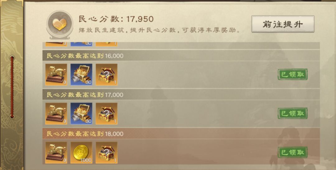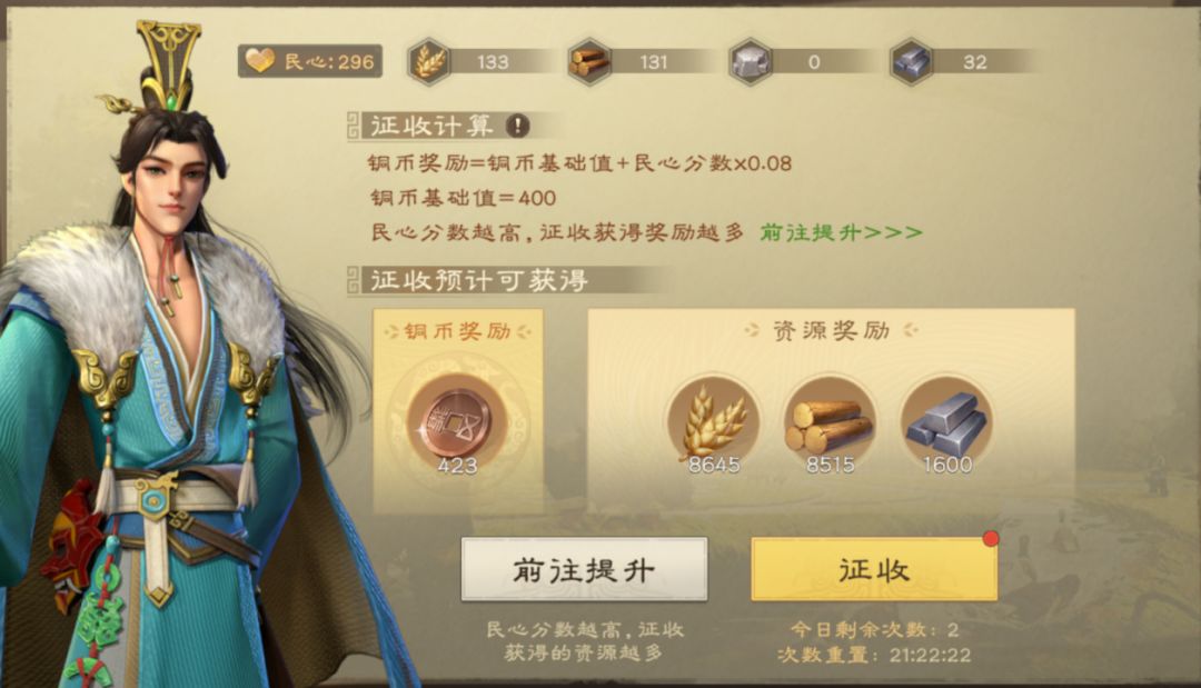 由于征收的奖励与民心分数有关,因此该玩法的最终目的,就是获取更高的民心分数。
