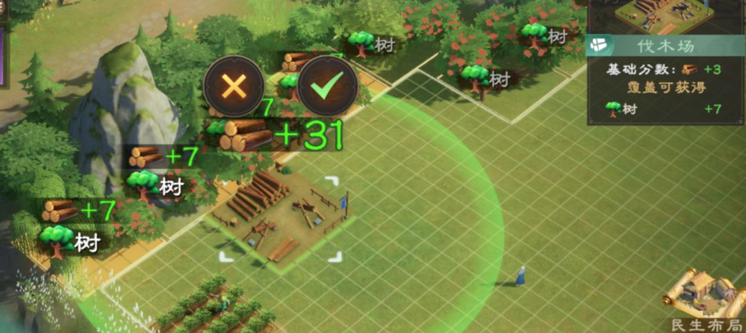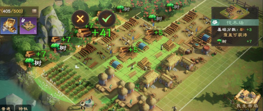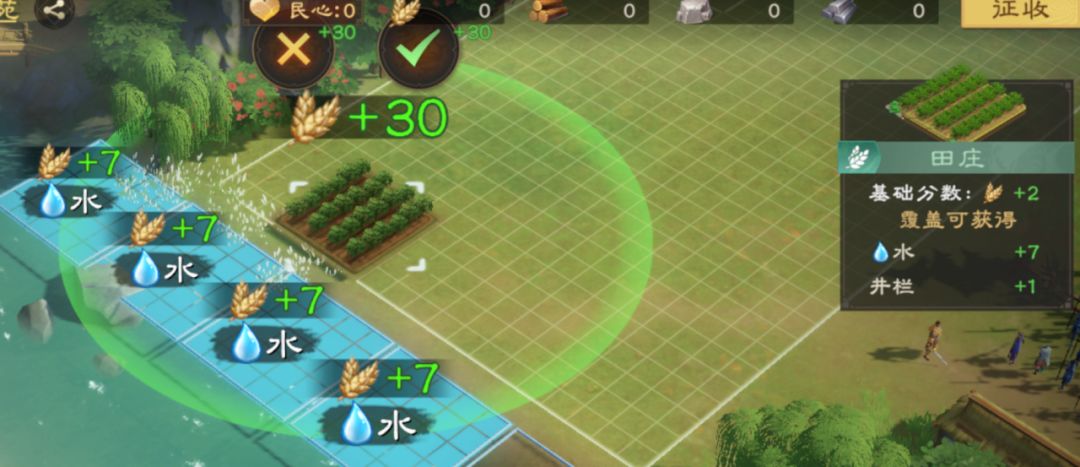 1.资源类建筑,如田庄,伐木场。需要摆放在自然资源边上,其有效范围覆盖尽可能多的自然资源,便可获取高分。