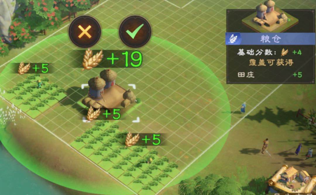 下图中,粮仓有效范围内覆盖了更多的田庄,也可以获得高分。