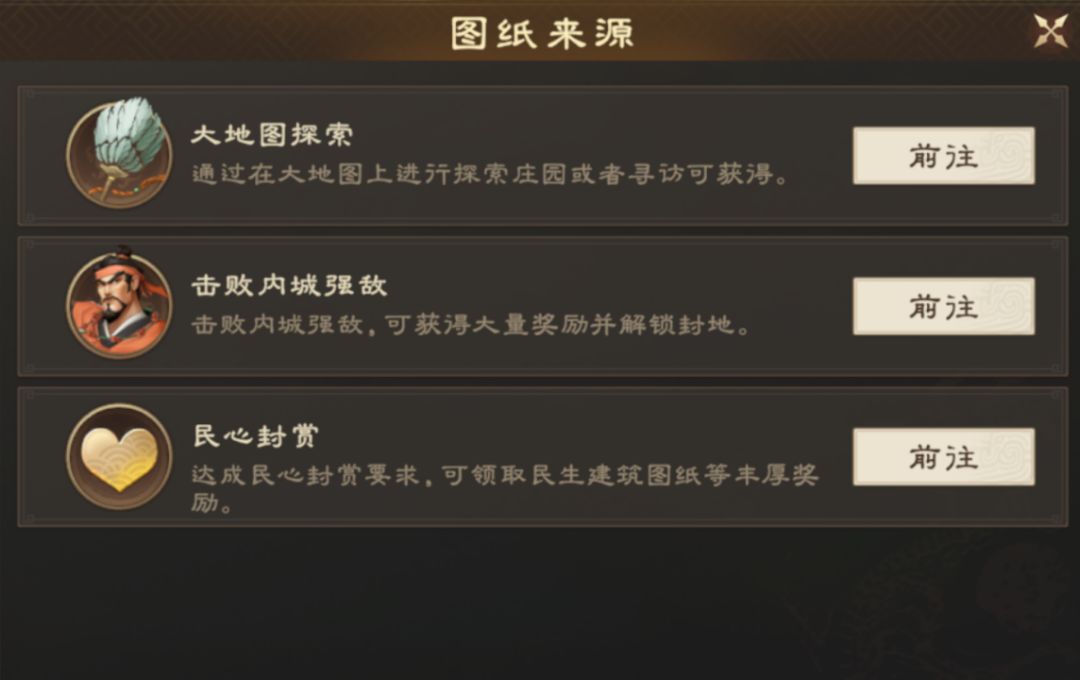 除开合理的建筑摆放,也需要更多的建筑图纸来摆满封地,主公可以在缺乏图纸时,通过游戏内指引来获取。