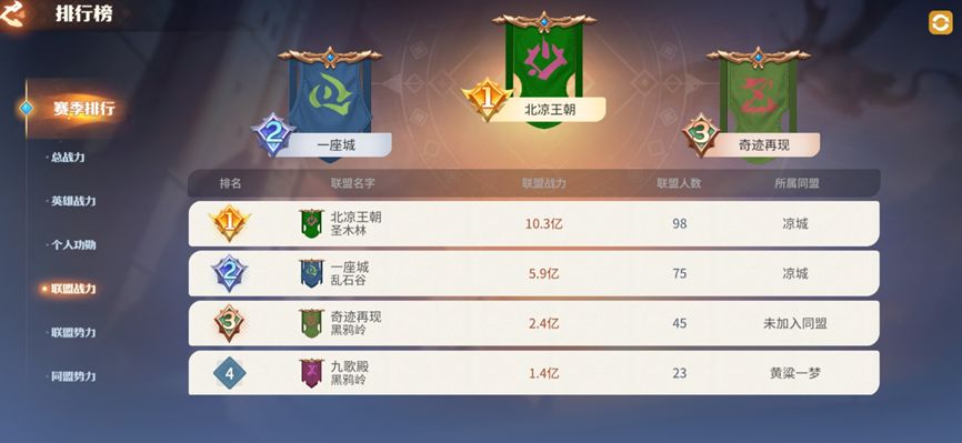 目前区服在赛季末整合后,【北凉王朝】将大部分高战吸收,联盟战力突破10亿,区服第二联盟【一座城】仅有75人左右,战力5.9亿。