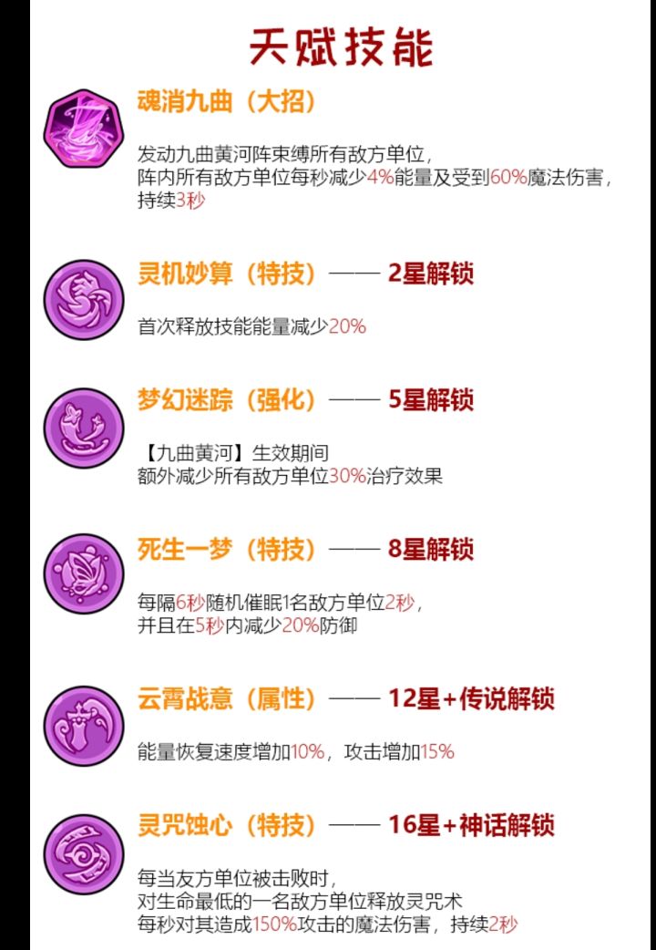 死生一梦(特技,8 星解锁):每隔 6 秒随机催眠 1 名敌方单位 2 秒,且在 5 秒内减少其 20% 防御,干扰敌方并降低其生存能力。