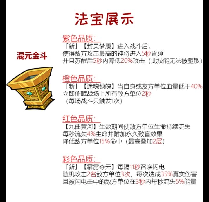 橙色品质(迷魂锁魄):自身或友方单位血量低于 40% 时,立即催眠战场上所有敌方单位 2 秒,每场战斗仅触发 1 次,关键时候能控场。
